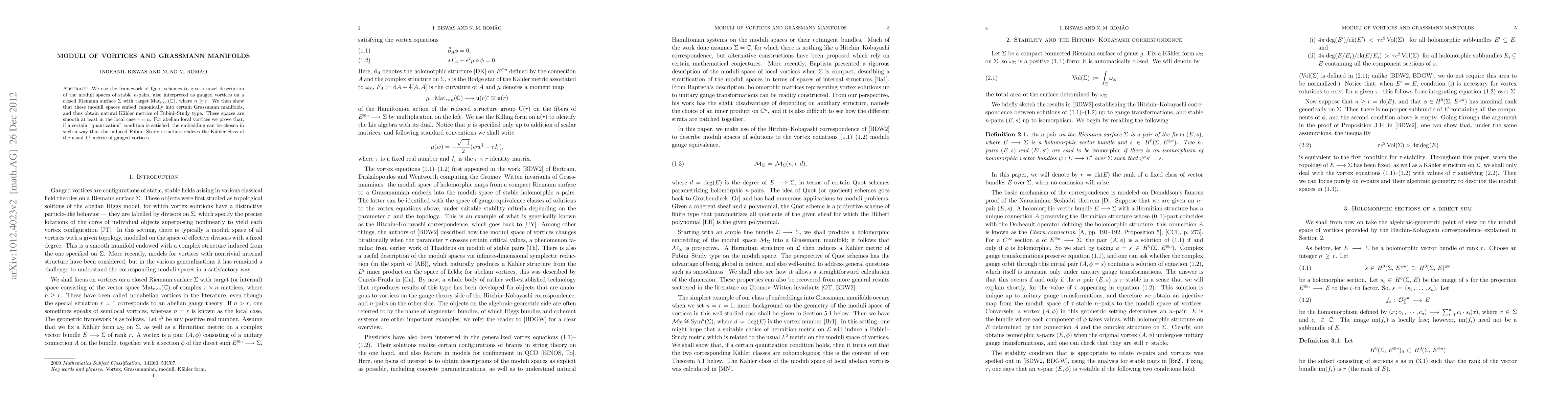 We use the framework of Quot schemes to give a novel description of the moduli spaces of stable n-pairs, also interpreted as gauged vortices on a closed Riemann surface with target Mat(r x n, C), where n >= r. We then show that these moduli spaces embed canonically into certain Grassmann manifolds, and thus obtain natural Kaehler metrics of Fubini-Study type; these spaces are smooth at least in the local case r=n. For abelian local vortices we prove that, if a certain "quantization" condition is satisfied, the embedding can be chosen in such a way that the induced Fubini-Study structure realizes the Kaehler class of the usual L^2 metric of gauged vortices.