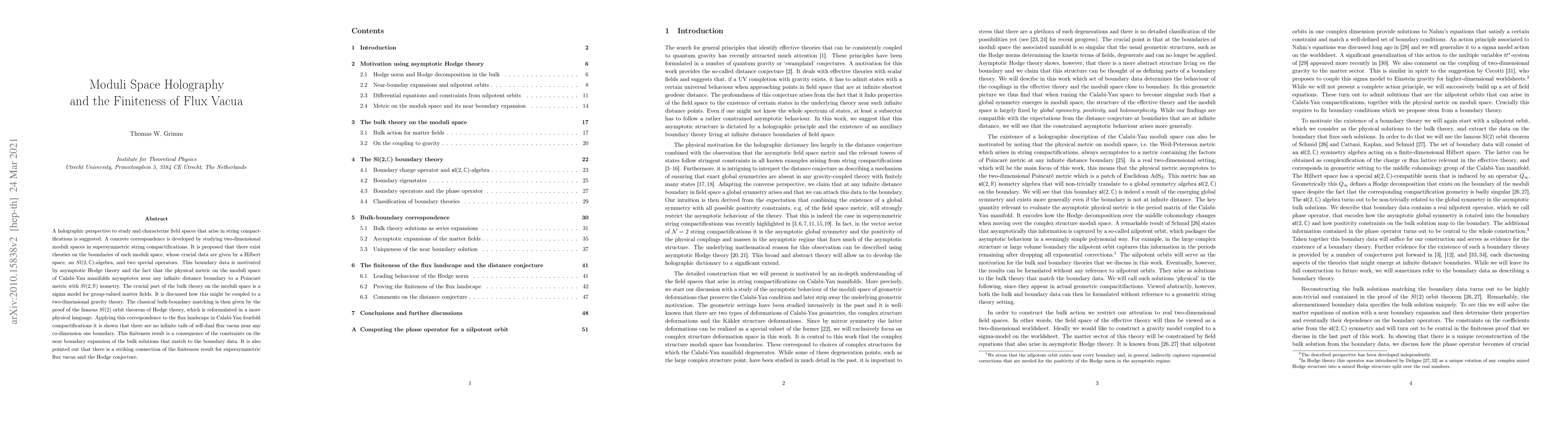 This paper proposes a holographic framework to study moduli spaces in string theory, demonstrating that theories exist on their boundaries characterized by specific algebraic structures. It shows that Calabi-Yau compactifications exhibit finiteness in the number of self-dual flux vacua near boundaries, linked to constraints from Hodge theory and a connection to the Hodge conjecture.