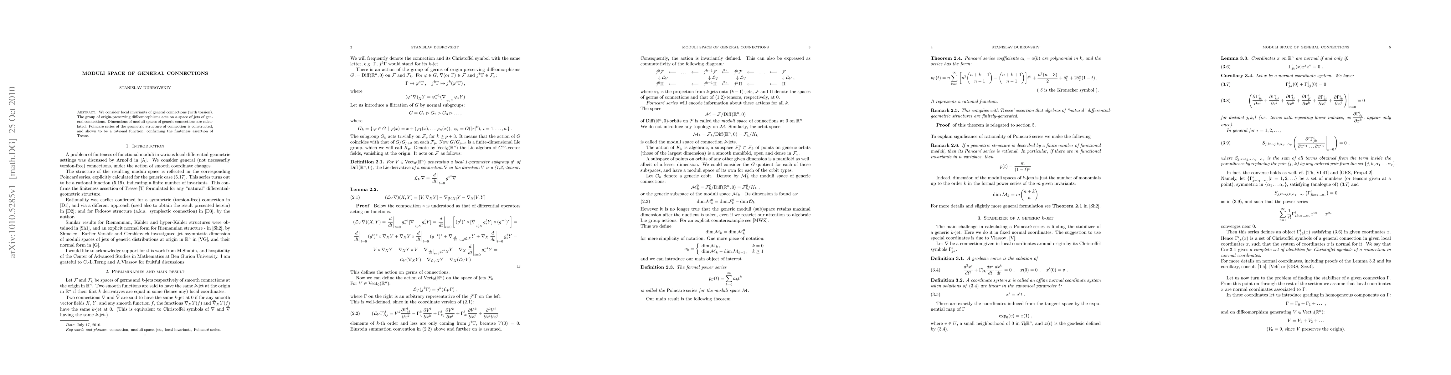 This research calculates dimensions of moduli spaces for generic general connections with torsion, using jet spaces and diffeomorphism groups. It confirms Tresse's assertion about the finiteness of these spaces through a rational Poincaré series.
