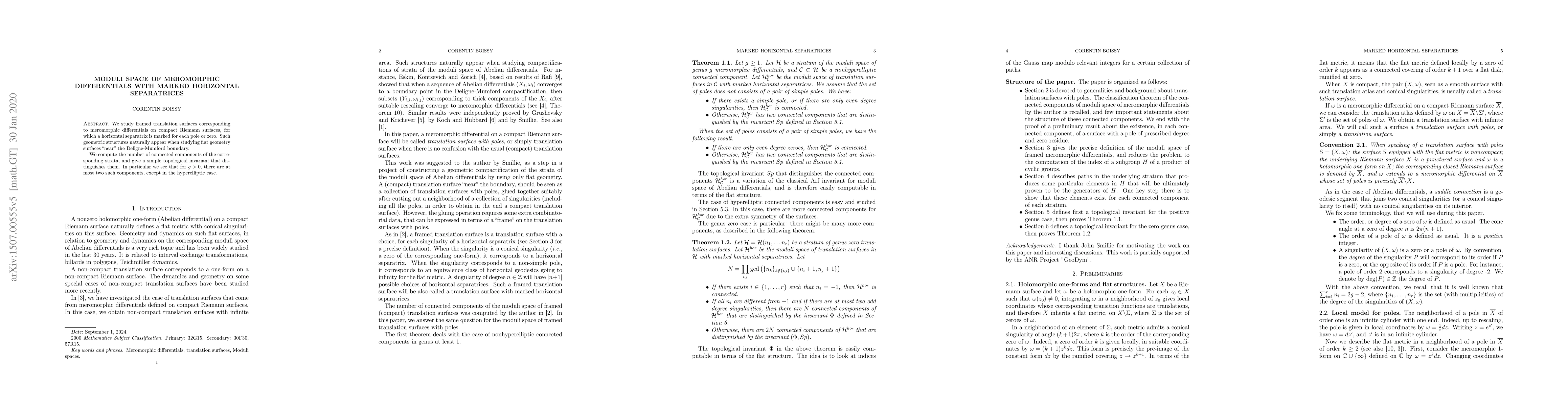 Summary: This paper investigates framed translation surfaces linked to meromorphic differentials on compact Riemann surfaces, focusing on those with marked horizontal separatrices. It computes the number of connected components in the corresponding strata and identifies a topological invariant distinguishing them, revealing that for $g>0$, there are at most two components, except in the hyperelliptic case.