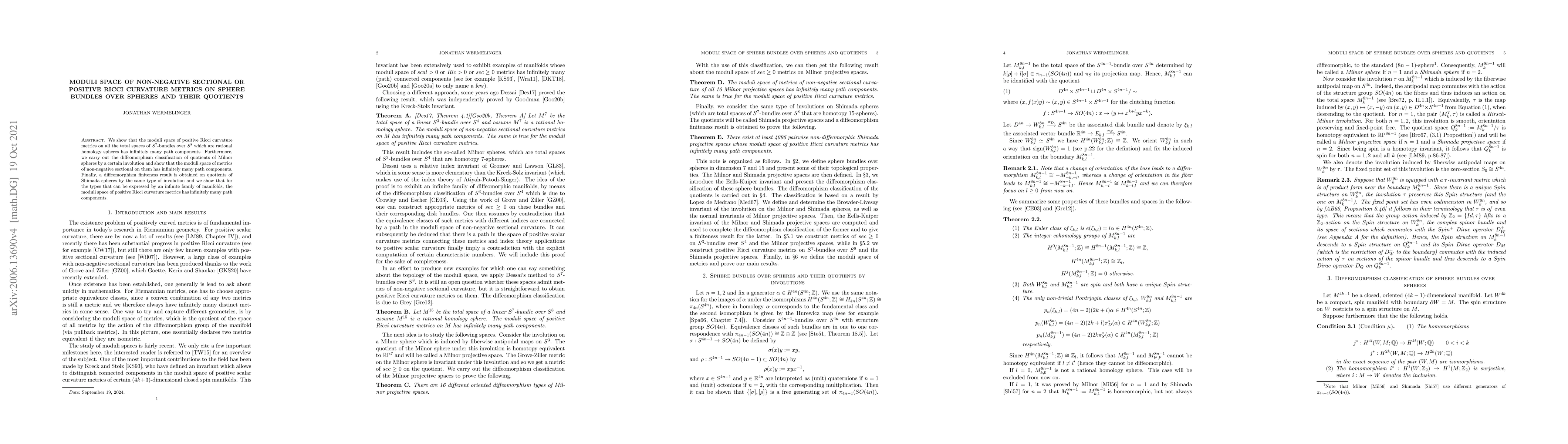 Summary: The paper demonstrates that the moduli space of positive Ricci curvature metrics on $S^7$-bundles over $S^8$ has infinitely many path components. It also investigates quotients of Milnor and Shimada spheres, showing that their moduli spaces of metrics, including those of non-negative sectional curvature, have infinitely many path components when subjected to specific involutions.
