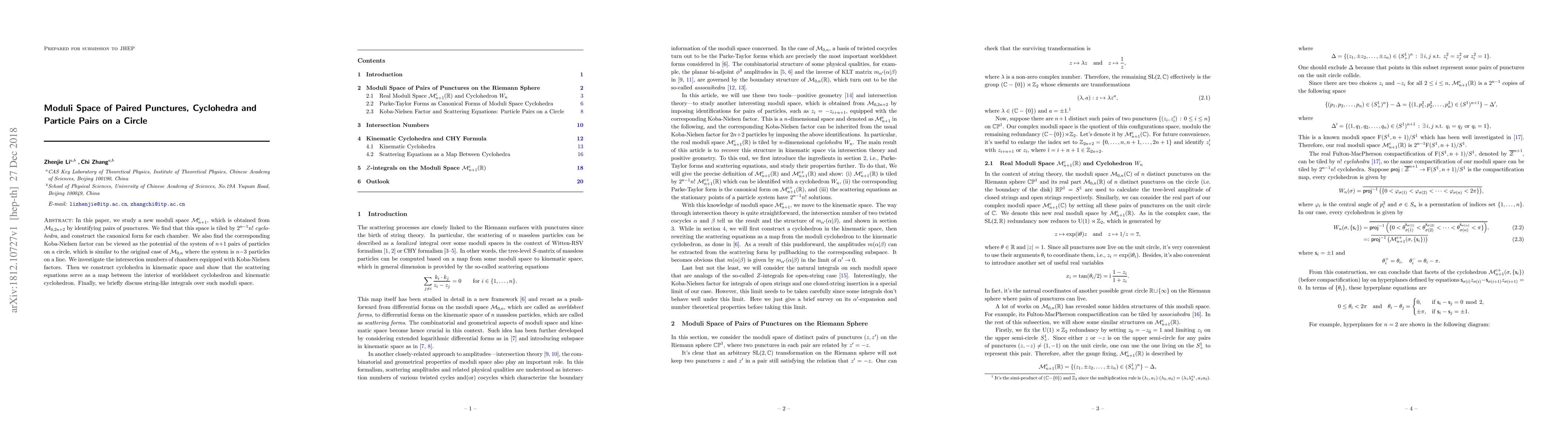 This paper introduces a moduli space $\mathcal{M}_{n+1}^{\mathrm{c}}$ derived from $\mathcal{M}_{0,2n+2}$ by pairing punctures, revealing it is tiled by $2^{n-1}n!$ cyclohedra and providing their canonical form. It also explores the Koba-Nielsen factor as a potential for $n+1$ particle pairs on a circle and discusses scattering equations mapping worldsheet to kinematic cyclohedra.