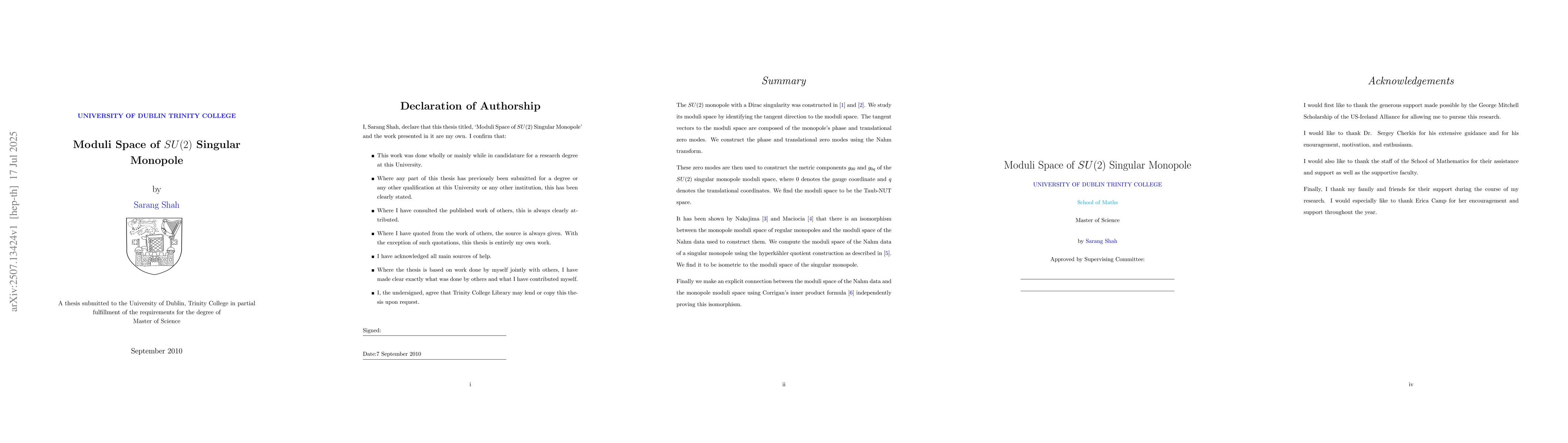 The $SU(2)$ monopole with a Dirac singularity was constructed in Durcan (2007) and Cherkis and Durcan (2007). We study its moduli space by identifying the tangent direction to the moduli space. The tangent vectors to the moduli space are composed of the monopole's phase and translational zero modes. We construct the phase and translational zero modes using the Nahm transform. These zero modes are then used to construct the metric components $g_{00}$ and $g_{0q}$ of the $SU(2)$ singular monopole moduli space, where $0$ denotes the gauge coordinate and q denotes the translational coordinates. We find the moduli space to be the Taub-NUT space. It has been shown by Nakajima (1990) and Maciocia (1991) that there is an isomorphism between the monopole moduli space of regular monopoles and the moduli space of the Nahm data used to construct them. We compute the moduli space of the Nahm data of a singular monopole using the hyperk\"ahler quotient construction as described in Gibbons and Rychenkova (1997). We find it to be isometric to the moduli space of the singular monopole. Finally we make an explicit connection between the moduli space of the Nahm data and the monopole moduli space using Corrigan's inner product formula (Osborn 1981) independently proving this isomorphism.