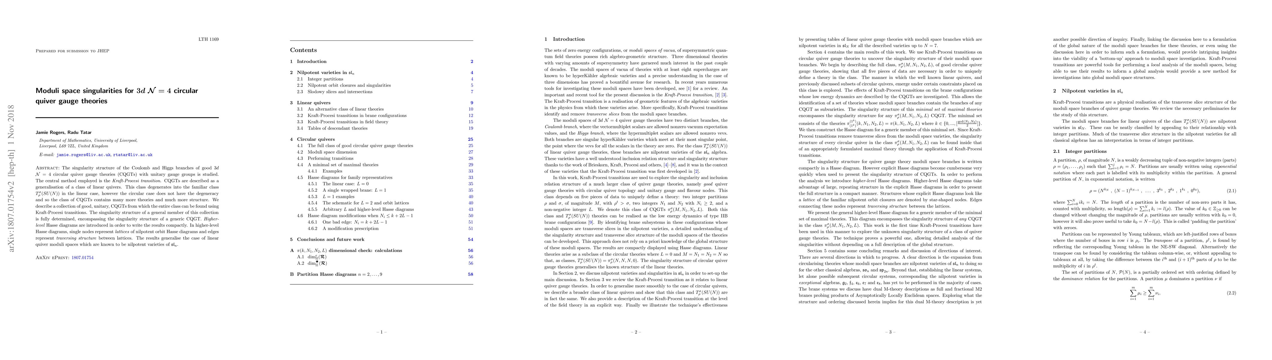 The singularity structure of the Coulomb and Higgs branches of good $3d$ $\mathcal{N}=4$ circular quiver gauge theories (CQGTs) with unitary gauge groups is studied. The central method employed is the Kraft--Procesi transition. CQGTs are described as a generalisation of a class of linear quivers. This class degenerates into the familiar class $T_{\rho}^{\sigma}(SU(N))$ in the linear case, however the circular case does not have the degeneracy and so the class of CQGTs contains many more theories and much more structure. We describe a collection of good, unitary, CQGTs from which the entire class can be found using Kraft--Procesi transitions. The singularity structure of a general member of this collection is fully determined, encompassing the singularity structure of a generic CQGT. Higher-level Hasse diagrams are introduced in order to write the results compactly. In higher-level Hasse diagrams, single nodes represent lattices of nilpotent orbit Hasse diagrams and edges represent traversing structure between lattices. The results generalise the case of linear quiver moduli spaces which are known to be nilpotent varieties of $\mathfrak{sl}_n$.