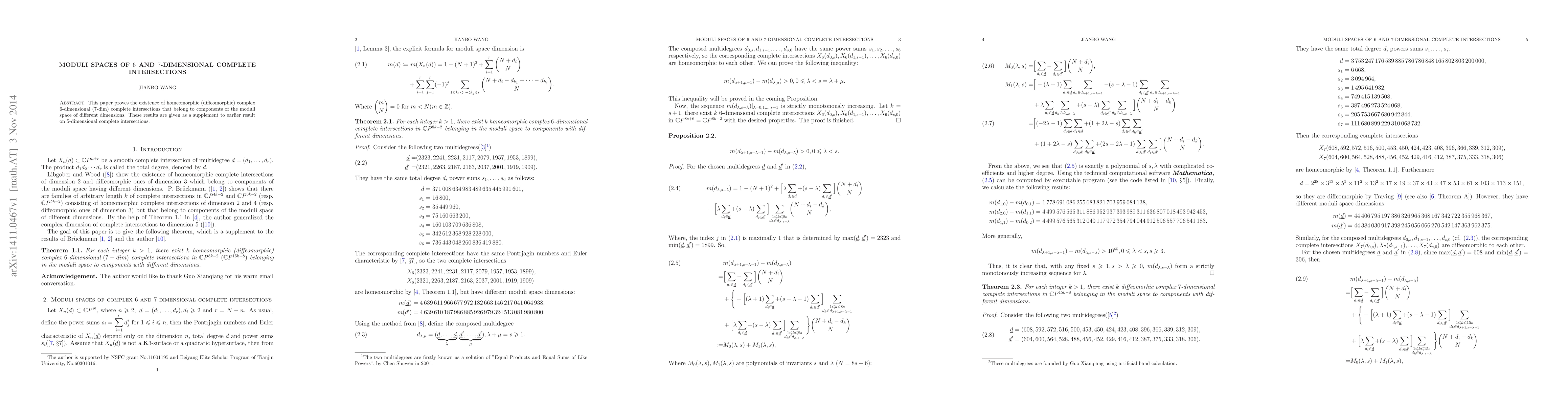 This paper proves the existence of homeomorphic (diffeomorphic) complex 6-dimensional (7-dim) complete intersections that belong to components of the moduli space of different dimensions. These results are given as a supplement to earlier result on 5-dimensional complete intersections.