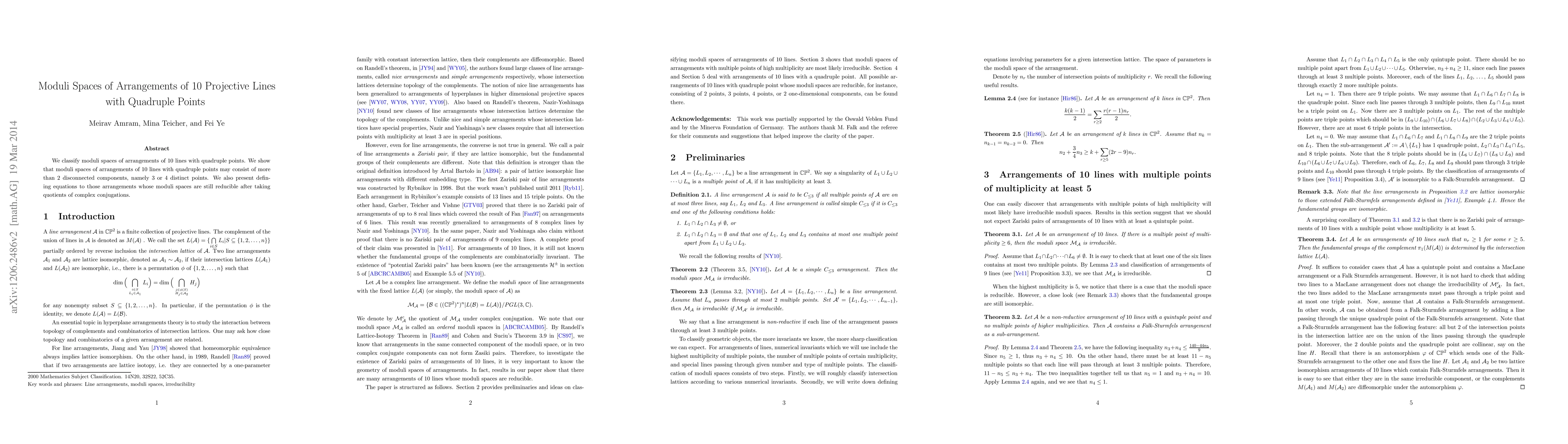 This paper classifies moduli spaces of arrangements of 10 projective lines with quadruple points, revealing that these spaces can have more than 2 disconnected components, specifically 3 or 4 distinct points. It also provides defining equations for arrangements whose moduli spaces remain reducible even after quotienting by complex conjugations.