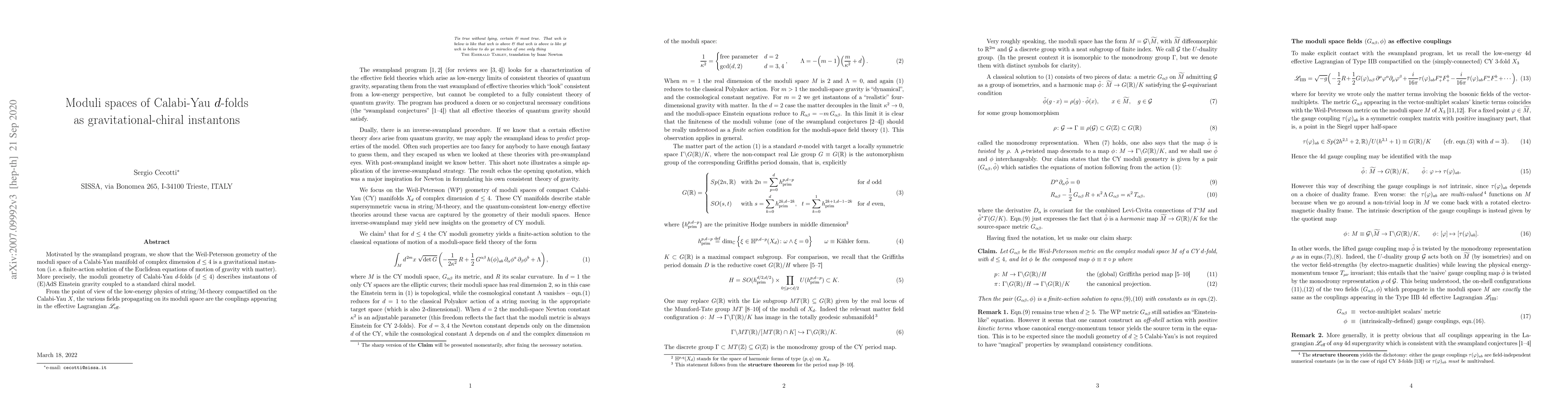Motivated by the swampland program, we show that the Weil-Petersson geometry of the moduli space of a Calabi-Yau manifold of complex dimension $d\leq4$ is a gravitational instanton (i.e. a finite-action solution of the Euclidean equations of motion of gravity with matter). More precisely, the moduli geometry of Calabi-Yau $d$-folds ($d\leq4$) describes instantons of (E)AdS Einstein gravity coupled to a standard chiral model. From the point of view of the low-energy physics of string/M-theory compactified on the Calabi-Yau $X$, the various fields propagating on its moduli space are the couplings appearing in the effective Lagrangian $\mathscr{L}_\text{eff}$.