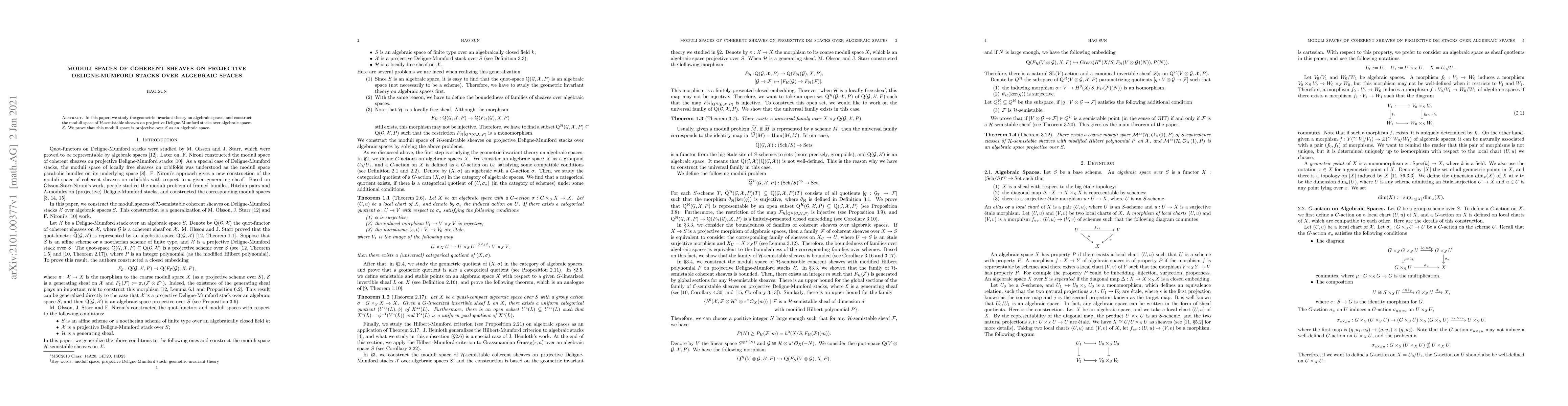 In this paper, we study the geometric invariant theory on algebraic spaces, and construct te moduli spaces of $\mathcal{H}$-semistable sheaves on projective Deligne-Mumford stacks over algebraic spaces $S$. We prove that this moduli space is projective over $S$ as an algebraic space.