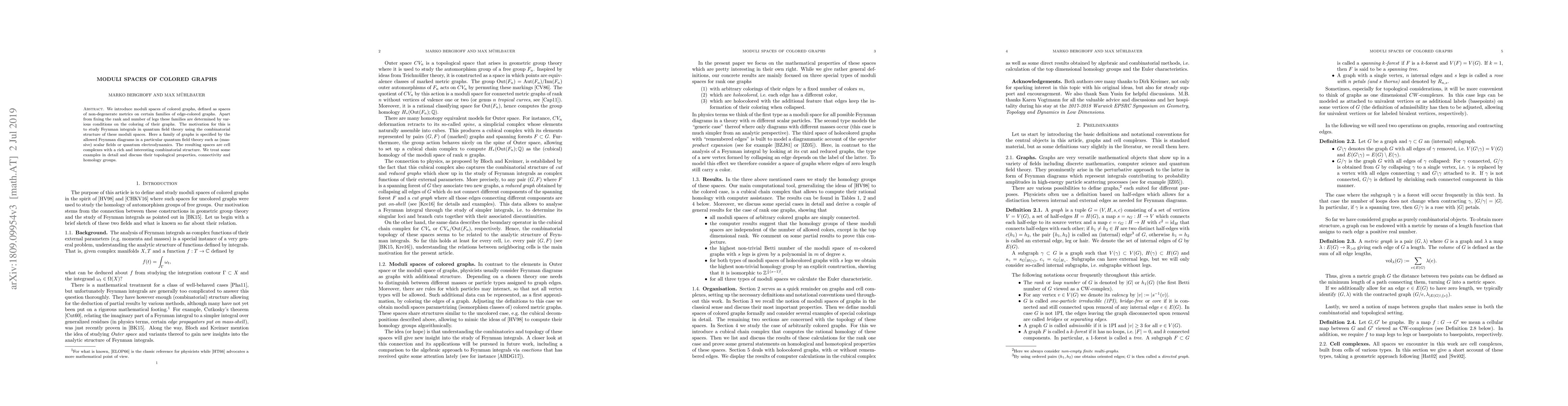 This paper introduces moduli spaces of colored graphs, which are spaces of non-degenerate metrics on edge-colored graph families, motivated by studying Feynman integrals in quantum field theory. The authors explore the topological properties, connectivity, and homology groups of these cell complexes.