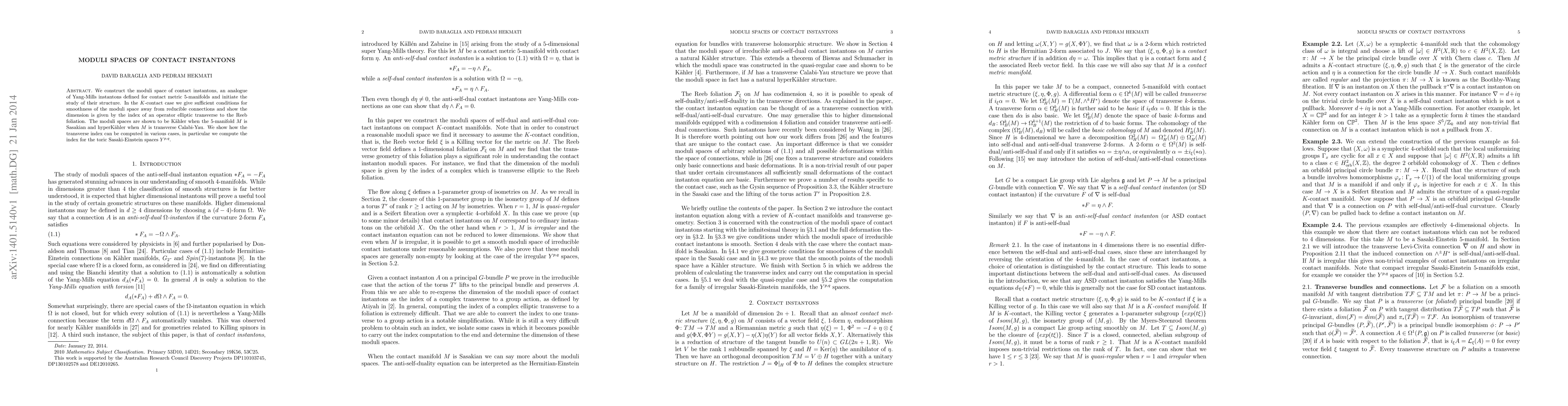 The paper constructs the moduli space of contact instantons on contact metric 5-manifolds and initiates their structural study. For K-contact manifolds, it provides conditions for moduli space smoothness and relates its dimension to an elliptic operator's index transverse to the Reeb foliation, proving Kähler and hyperKähler structures under specific conditions.