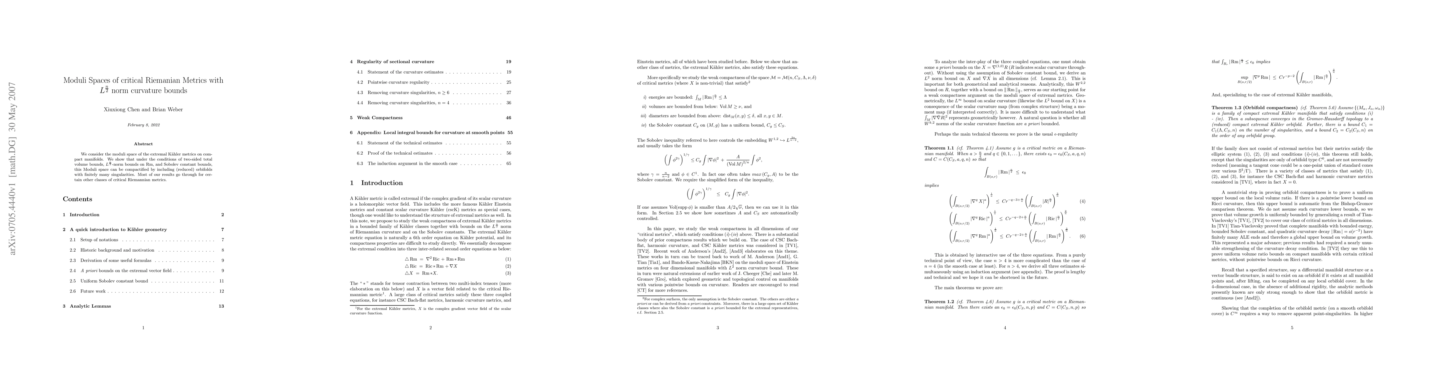 Summary: This paper studies the moduli space of extremal Kähler metrics on compact manifolds, demonstrating that under specific volume and curvature bounds, the space can be compactified by incorporating orbifolds with finite singularities. The findings extend to other classes of critical Riemannian metrics.