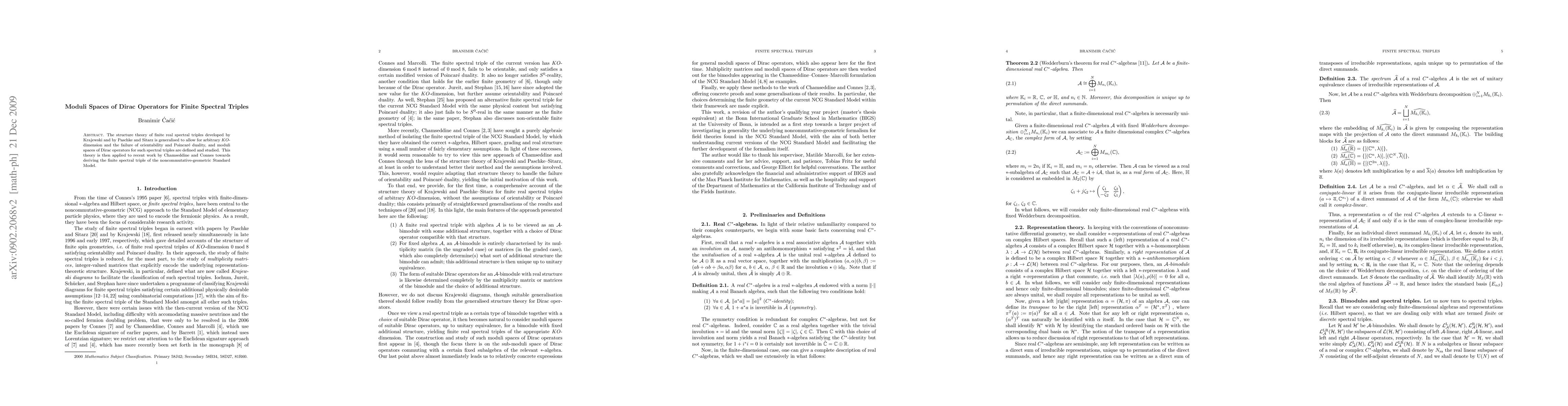 This paper generalizes the structure theory of finite real spectral triples to accommodate arbitrary KO-dimension and non-orientability, defining and studying moduli spaces of Dirac operators. It applies this framework to recent work on the noncommutative geometric Standard Model by Chamseddine and Connes.