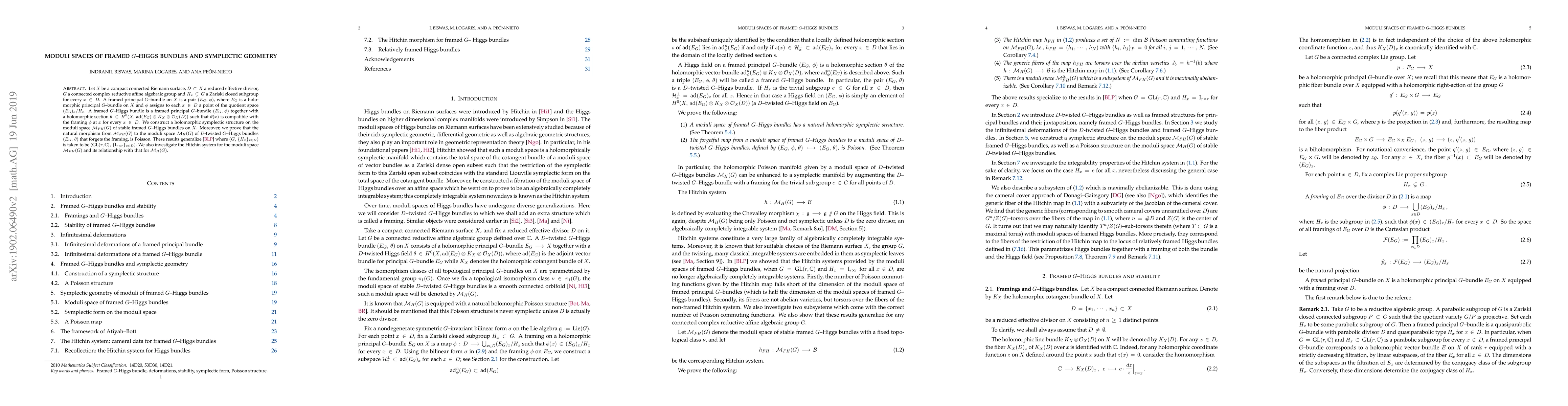 Let $X$ be a compact connected Riemann surface, $D\, \subset\, X$ a reduced effective divisor, $G$ a connected complex reductive affine algebraic group and $H_x\, \subsetneq\, G_x$ a Zariski closed subgroup for every $x\, \in\, D$. A framed principal $G$--bundle is a pair $(E_G,\, \phi)$, where $E_G$ is a holomorphic principal $G$--bundle on $X$ and $\phi$ assigns to each $x\, \in\, D$ a point of the quotient space $(E_G)_x/H_x$. A framed $G$--Higgs bundle is a framed principal $G$--bundle $(E_G,\, \phi)$ together with a section $\theta\, \in\, H^0(X,\, \text{ad}(E_G)\otimes K_X\otimes{\mathcal O}_X(D))$ such that $\theta(x)$ is compatible with the framing $\phi$ for every $x\, \in\, D$. We construct a holomorphic symplectic structure on the moduli space $\mathcal{M}_{FH}(G)$ of stable framed $G$--Higgs bundles. Moreover, we prove that the natural morphism from $\mathcal{M}_{FH}(G)$ to the moduli space $\mathcal{M}_{H}(G)$ of $D$-twisted $G$--Higgs bundles $(E_G,\, \theta)$ that forgets the framing, is Poisson. These results generalize \cite{BLP} where $(G,\, \{H_x\}_{x\in D})$ is taken to be $(\text{GL}(r,{\mathbb C}),\, \{\text{I}_{r\times r}\}_{x\in D})$. We also investigate the Hitchin system for $\mathcal{M}_{FH}(G)$ and its relationship with that for $\mathcal{M}_{H}(G)$.