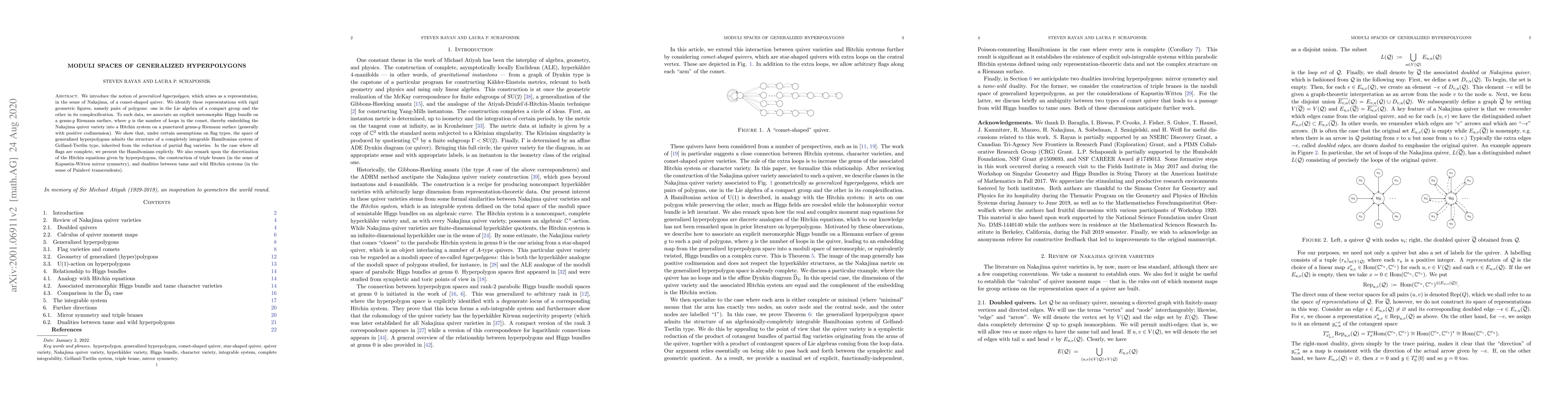 We introduce the notion of generalized hyperpolygon, which arises as a representation, in the sense of Nakajima, of a comet-shaped quiver. We identify these representations with rigid geometric figures, namely pairs of polygons: one in the Lie algebra of a compact group and the other in its complexification. To such data, we associate an explicit meromorphic Higgs bundle on a genus-$g$ Riemann surface, where $g$ is the number of loops in the comet, thereby embedding the Nakajima quiver variety into a Hitchin system on a punctured genus-$g$ Riemann surface (generally with positive codimension). We show that, under certain assumptions on flag types, the space of generalized hyperpolygons admits the structure of a completely integrable Hamiltonian system of Gelfand-Tsetlin type, inherited from the reduction of partial flag varieties. In the case where all flags are complete, we present the Hamiltonians explictly. We also remark upon the discretization of the Hitchin equations given by hyperpolygons, the construction of triple branes (in the sense of Kapustin-Witten mirror symmetry), and dualities between tame and wild Hitchin systems (in the sense of Painlev\'e transcendents).