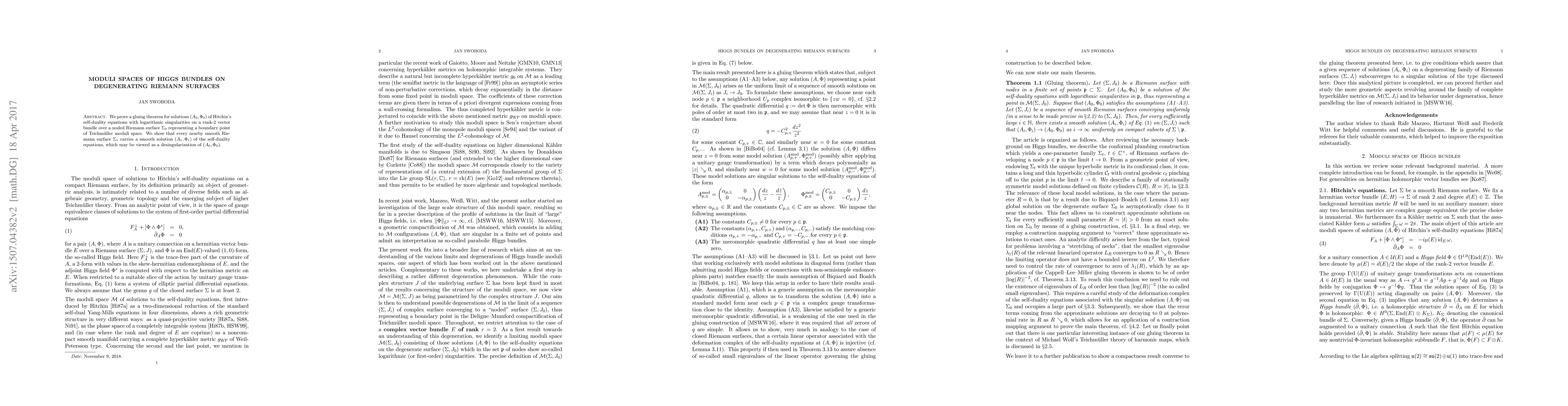 Summary: The paper establishes a gluing theorem for solutions of Hitchin's self-duality equations with logarithmic singularities on a rank-2 vector bundle over a degenerating Riemann surface, situating it at the boundary of Teichmüller moduli space.