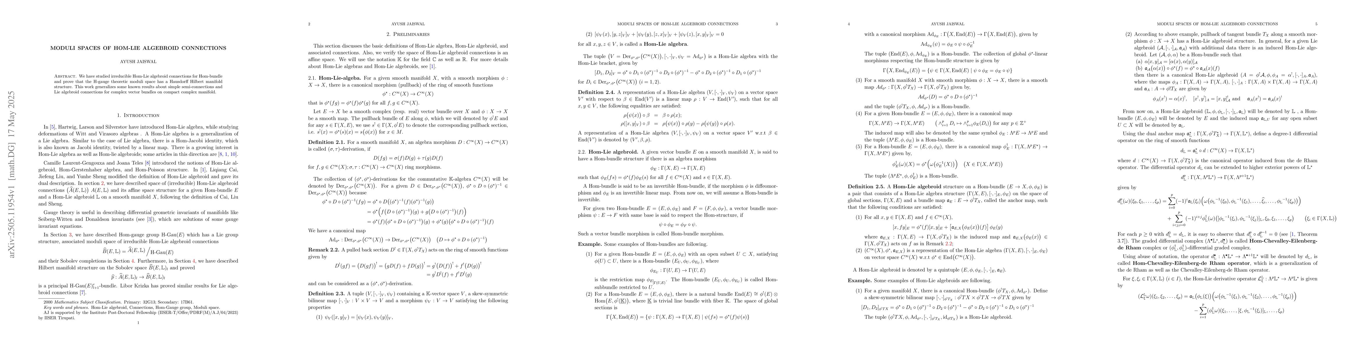The paper proves that the moduli space of irreducible Hom-Lie algebroid connections possesses a Hausdorff Hilbert manifold structure, generalizing previous results on simple semi-connections and Lie algebroid connections.