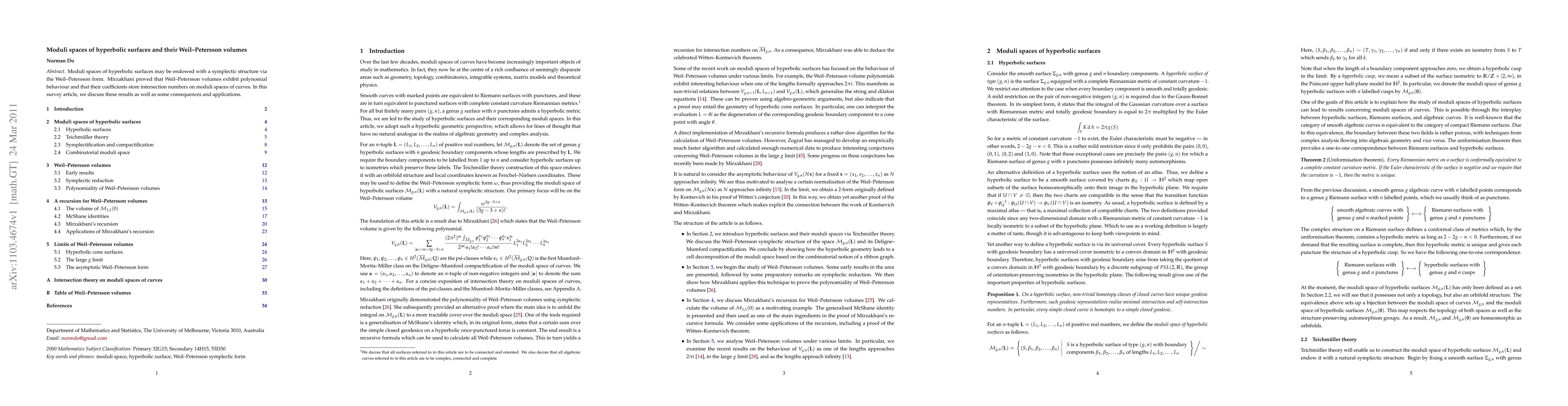 This paper surveys Mirzakhani's findings on the symplectic structure of moduli spaces of hyperbolic surfaces via the Weil-Petersson form, highlighting the polynomial behavior of Weil-Petersson volumes and their connection to intersection numbers on moduli spaces of curves. It discusses implications and applications of these results.