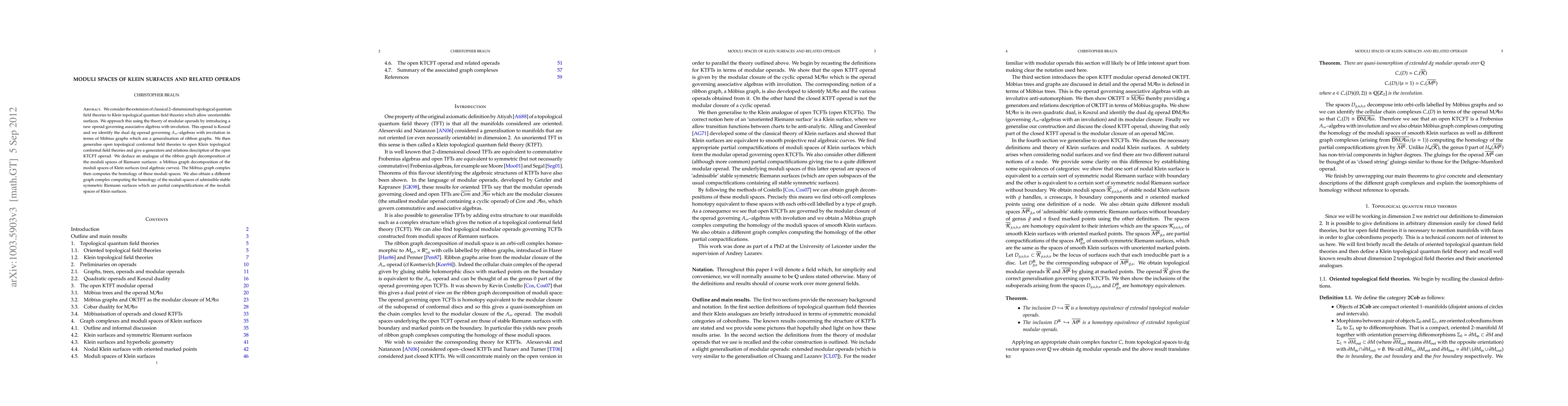 This paper extends classical 2D topological quantum field theories to Klein topological quantum field theories using modular operads, introducing a Koszul operad for associative algebras with involution. It presents a Mobius graph decomposition of moduli spaces of Klein surfaces and computes their homology, alongside a separate graph complex for moduli spaces of admissible stable symmetric Riemann surfaces.