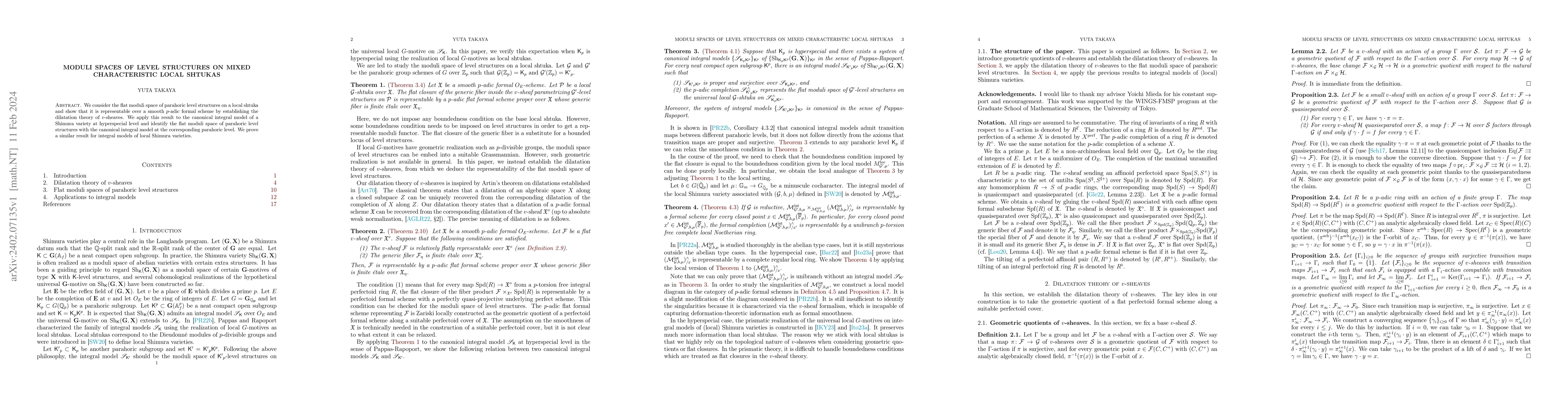 This paper establishes the representability of the moduli space of parahoric level structures on mixed characteristic local shtukas over a smooth $p$-adic formal scheme via dilatation theory of $v$-sheaves. It applies this to identify the flat moduli space with the canonical integral model of Shimura varieties at hyperspecial level.