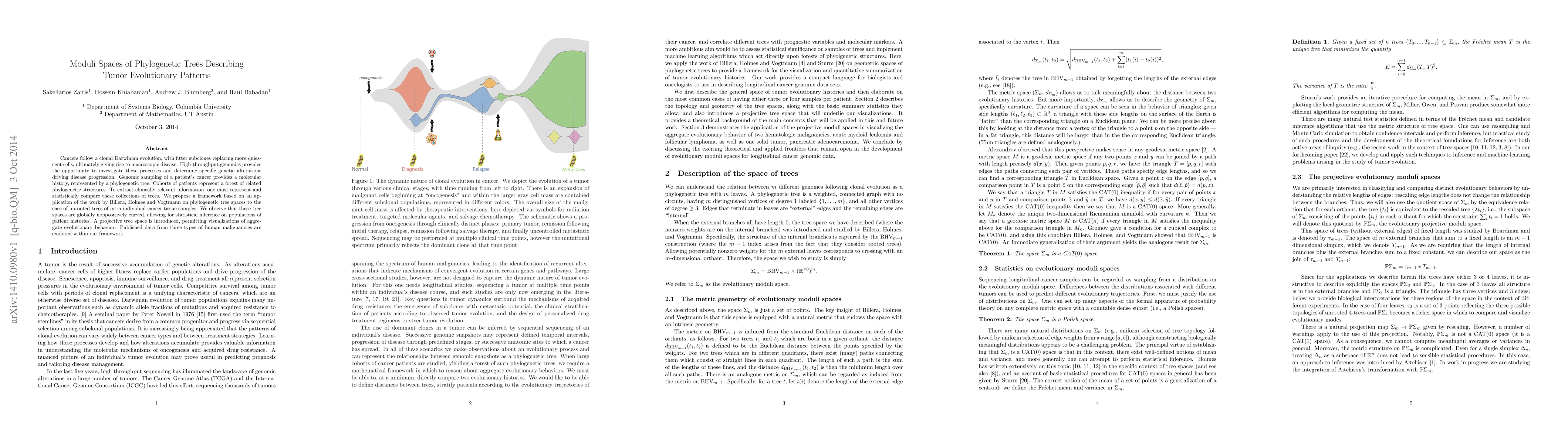 Cancers follow a clonal Darwinian evolution, with fitter subclones replacing more quiescent cells, ultimately giving rise to macroscopic disease. High-throughput genomics provides the opportunity to investigate these processes and determine specific genetic alterations driving disease progression. Genomic sampling of a patient's cancer provides a molecular history, represented by a phylogenetic tree. Cohorts of patients represent a forest of related phylogenetic structures. To extract clinically relevant information, one must represent and statistically compare these collections of trees. We propose a framework based on an application of the work by Billera, Holmes and Vogtmann on phylogenetic tree spaces to the case of unrooted trees of intra-individual cancer tissue samples. We observe that these tree spaces are globally nonpositively curved, allowing for statistical inference on populations of patient histories. A projective tree space is introduced, permitting visualizations of aggregate evolutionary behavior. Published data from three types of human malignancies are explored within our framework.