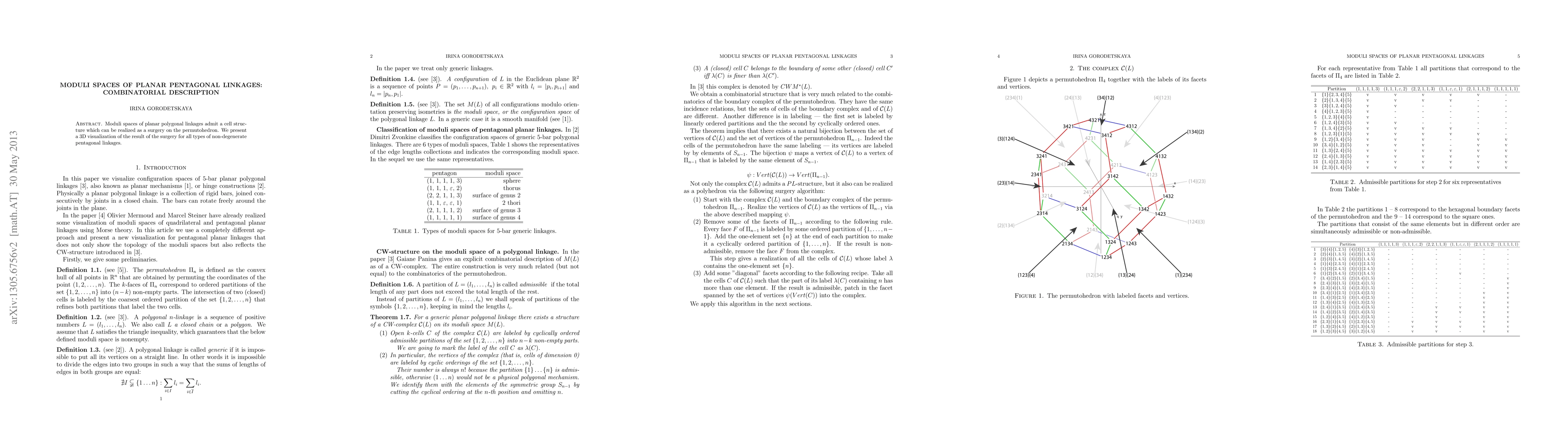 Moduli spaces of planar polygonal linkages admit a cell structure which can be realized as a surgery on the permutohedron. We present a 3D visualization of the result of the surgery for all types of non-degenerate pentagonal linkages.