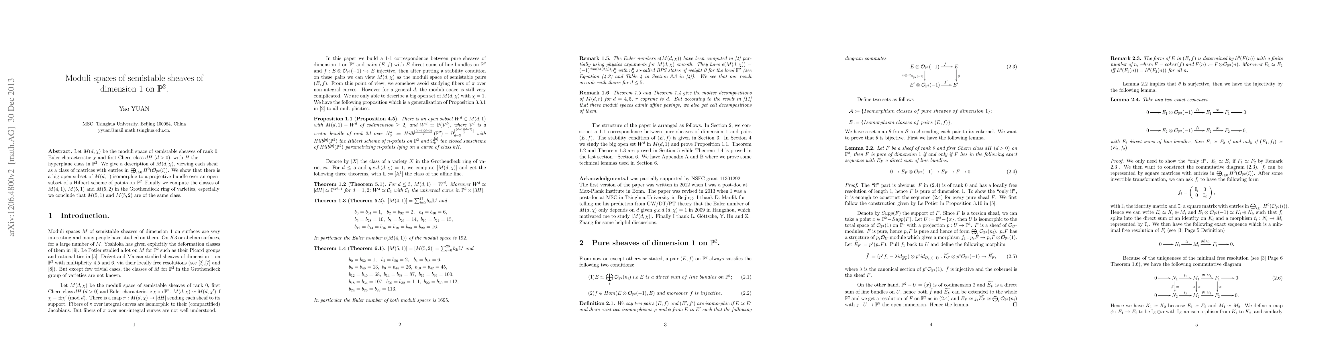 This paper describes the moduli space $M(d,\chi)$ of semistable sheaves on $\mathbb{P}^2$ and shows that a significant open subset of $M(d,1)$ is isomorphic to a projective bundle over a Hilbert scheme of points on $\mathbb{P}^2$. It also computes the Grothendieck classes of $M(4,1)$, $M(5,1)$, and $M(5,2)$, concluding that $M(5,1)$ and $M(5,2)$ share the same class.