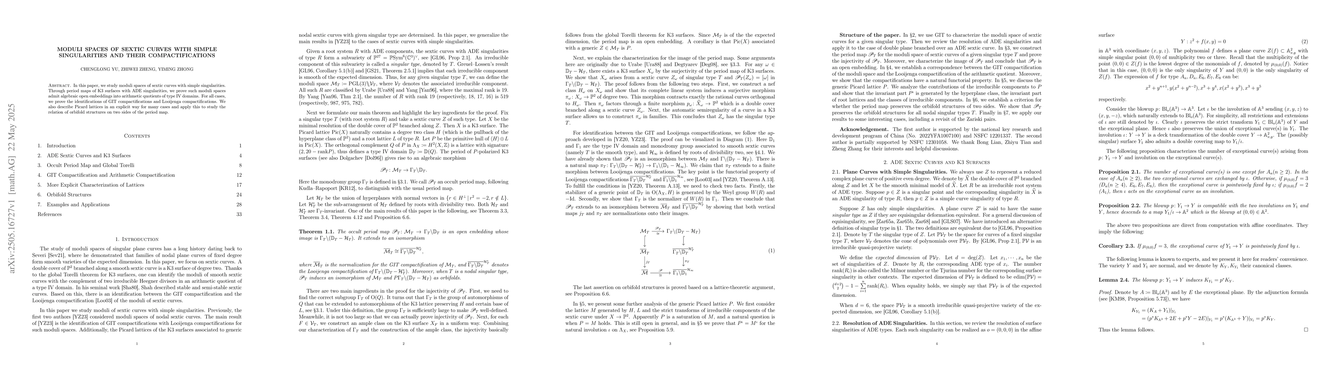 The paper presents a detailed analysis linking moduli spaces of sextic curves with simple singularities to arithmetic quotients via period maps, establishing connections between GIT and Looijenga compactifications.