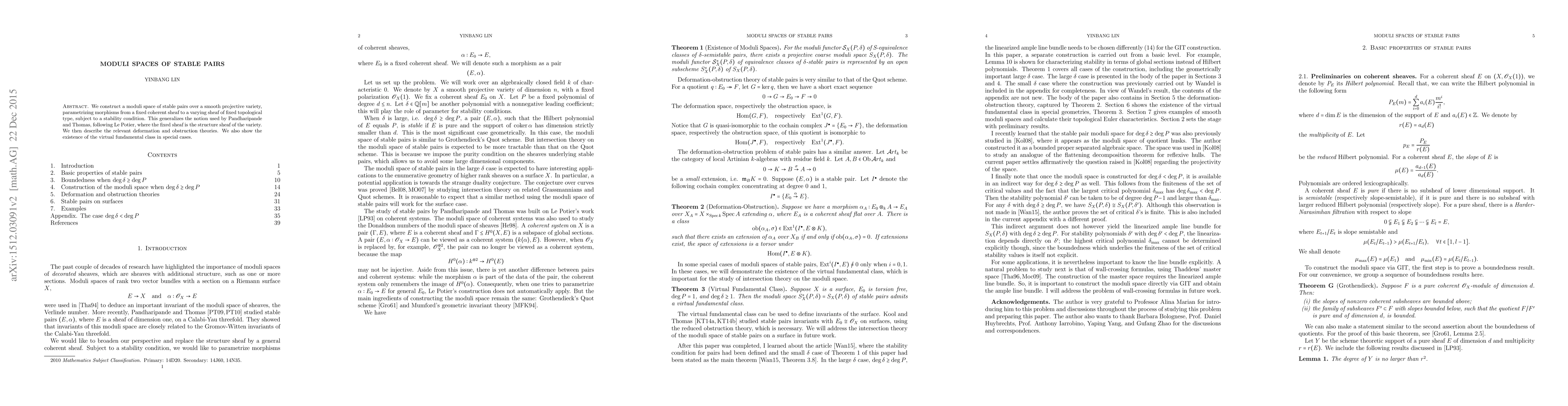 Researchers construct a moduli space for stable pairs over smooth projective varieties, generalizing a previous concept and describing deformation and obstruction theories, with implications for understanding morphisms between coherent sheaves.