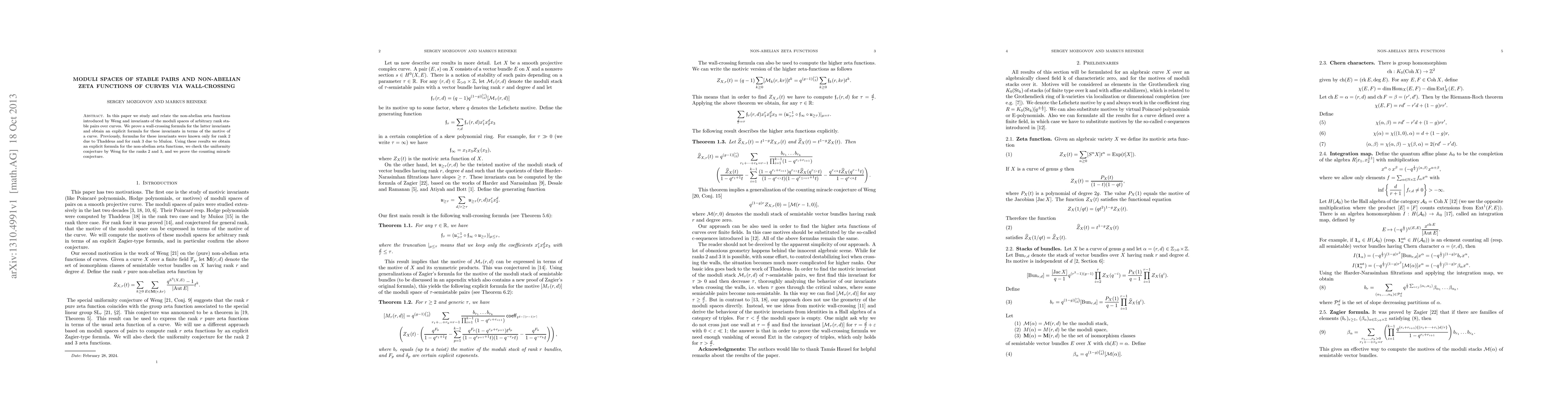The paper introduces a wall-crossing formula for invariants of moduli spaces of stable pairs and provides explicit formulas for non-abelian zeta functions of curves, linking them to the motive of a curve.
