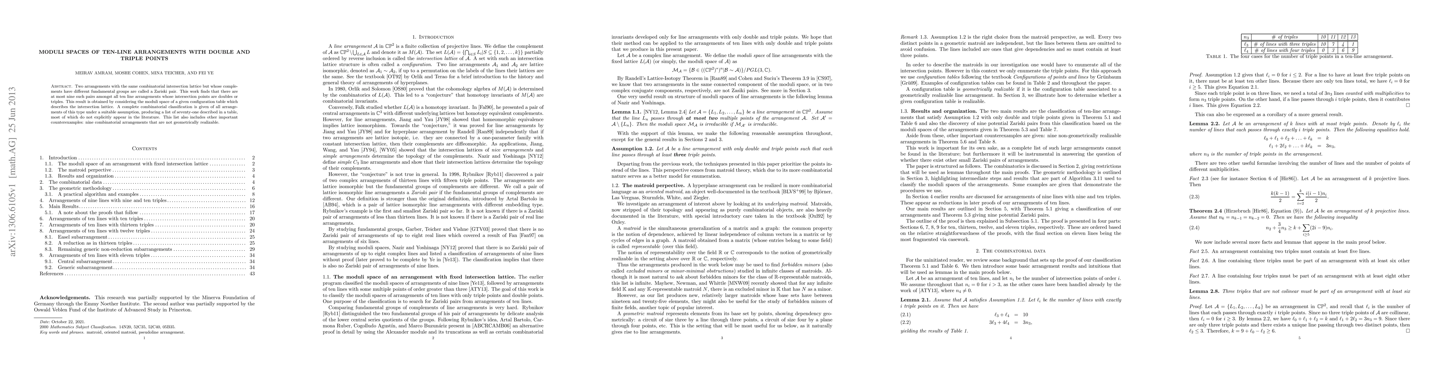 Two arrangements with the same combinatorial intersection lattice but whose complements have different fundamental groups are called a Zariski pair. This work finds that there are at most nine such pairs amongst all ten line arrangements whose intersection points are doubles or triples. This result is obtained by considering the moduli space of a given configuration table which describes the intersection lattice. A complete combinatorial classification is given of all arrangements of this type under a suitable assumption, producing a list of seventy-one described in a table, most of which do not explicitly appear in the literature. This list also includes other important counterexamples: nine combinatorial arrangements that are not geometrically realizable.
