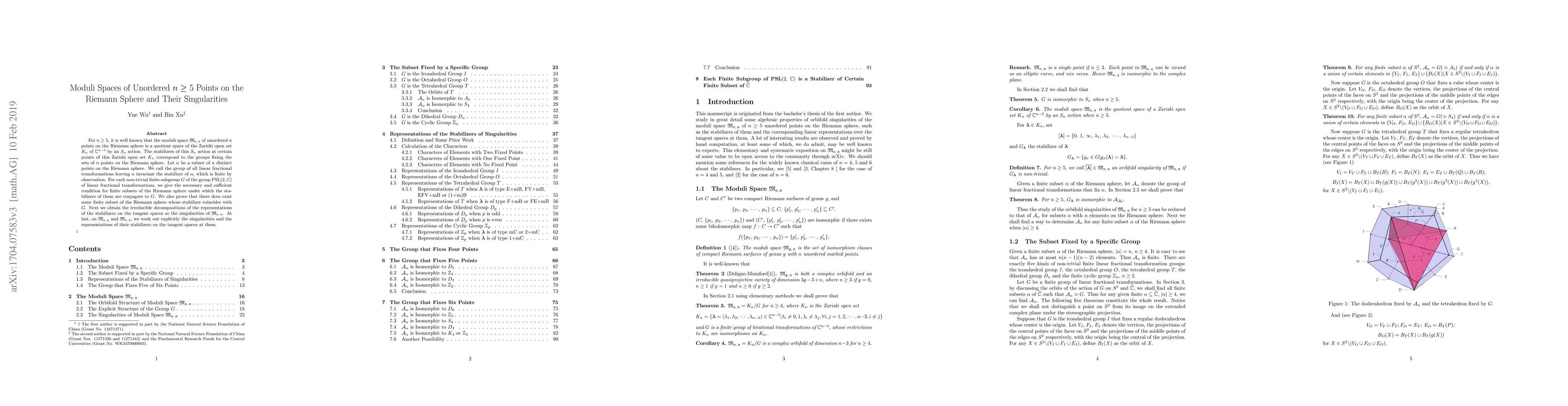 For $n\ge5$, it is well known that the moduli space $\mathfrak{M_{0,\:n}}$ of unordered $n$ points on the Riemann sphere is a quotient space of the Zariski open set $K_n$ of $\mathbb C^{n-3}$ by an $S_n$ action. The stabilizers of this $S_n$ action at certain points of this Zariski open set $K_n$ correspond to the groups fixing the sets of $n$ points on the Riemann sphere. Let $\alpha$ be a subset of $n$ distinct points on the Riemann sphere. We call the group of all linear fractional transformations leaving $\alpha$ invariant the stabilizer of $\alpha$, which is finite by observation. For each non-trivial finite subgroup $G$ of the group ${\rm PSL}(2,{\Bbb C})$ of linear fractional transformations, we give the necessary and sufficient condition for finite subsets of the Riemann sphere under which the stabilizers of them are conjugate to $G$. We also prove that there does exist some finite subset of the Riemann sphere whose stabilizer coincides with $G$. Next we obtain the irreducible decompositions of the representations of the stabilizers on the tangent spaces at the singularities of $\mathfrak{M_{0,\:n}}$. At last, on $\mathfrak{M_{0,\:5}}$ and $\mathfrak{M_{0,\:6}}$, we work out explicitly the singularities and the representations of their stabilizers on the tangent spaces at them.