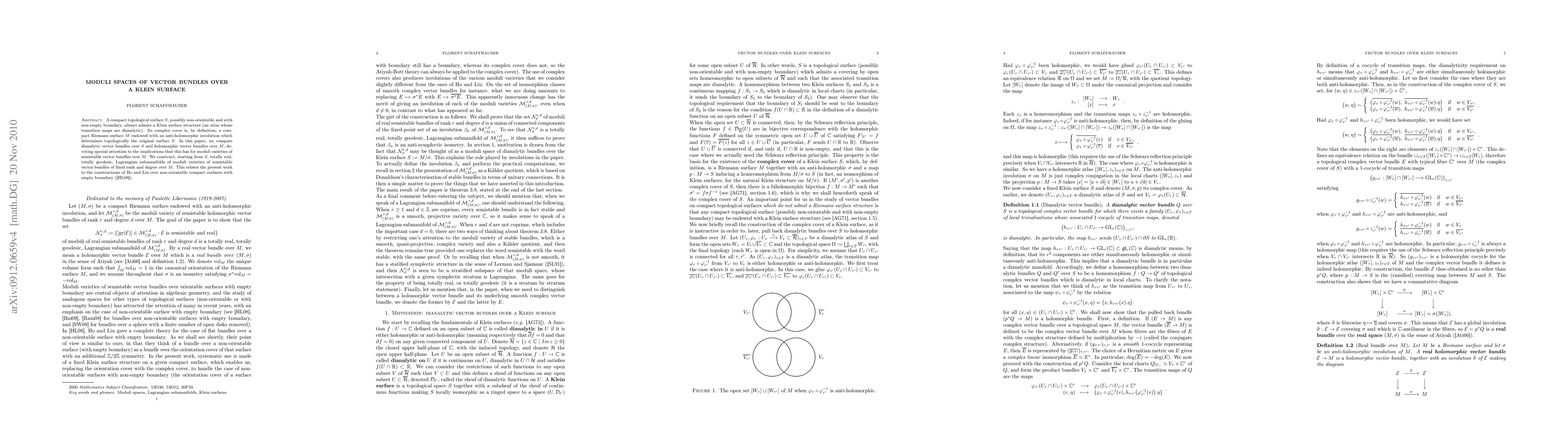 A compact topological surface S, possibly non-orientable and with non-empty boundary, always admits a Klein surface structure (an atlas whose transition maps are dianalytic). Its complex cover is, by definition, a compact Riemann surface M endowed with an anti-holomorphic involution which determines topologically the original surface S. In this paper, we compare dianalytic vector bundles over S and holomorphic vector bundles over M, devoting special attention to the implications that this has for moduli varieties of semistable vector bundles over M. We construct, starting from S, totally real, totally geodesic, Lagrangian submanifolds of moduli varieties of semistable vector bundles of fixed rank and degree over M. This relates the present work to the constructions of Ho and Liu over non-orientable compact surfaces with empty boundary (arXiv:math/0605587) .