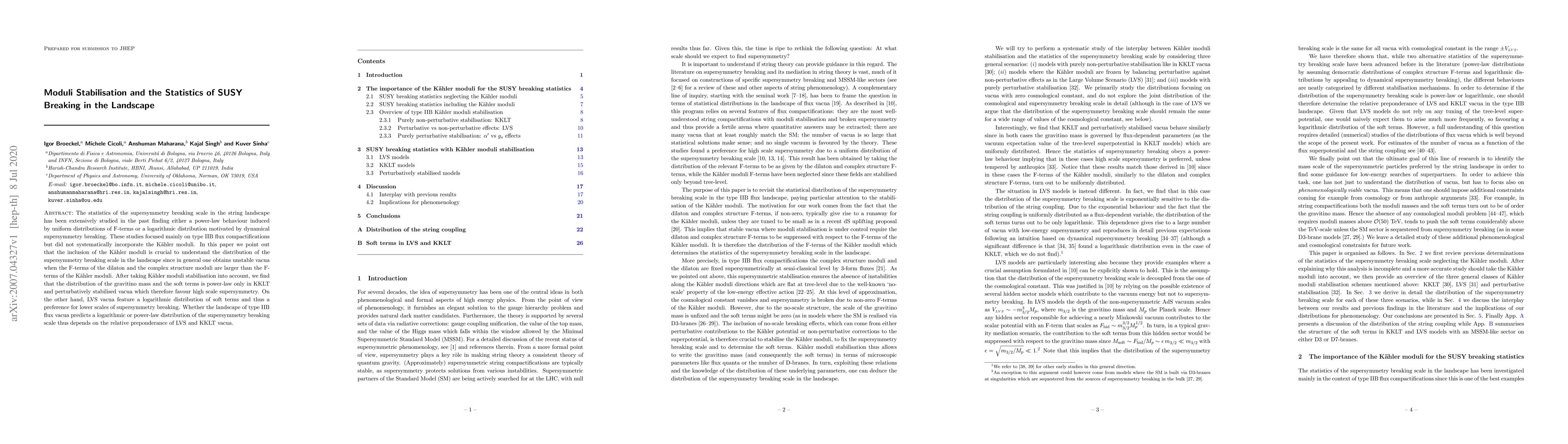This paper investigates the impact of stabilising Kähler moduli on the distribution of supersymmetry breaking scales in the string landscape, finding that while KKLT and perturbatively stabilised vacua favour a power-law distribution and high-scale supersymmetry, LVS vacua exhibit a logarithmic distribution, suggesting a preference for lower scales of supersymmetry breaking.