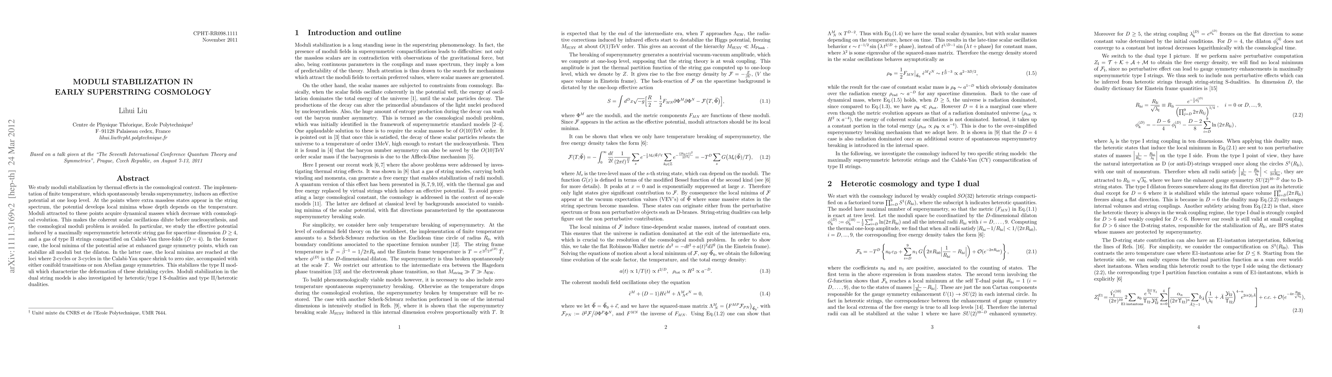 This research paper proposes a solution to the cosmological moduli problem in early superstring cosmology by introducing thermal effects that stabilize moduli through effective potentials, avoiding scalar oscillations before nucleosynthesis.