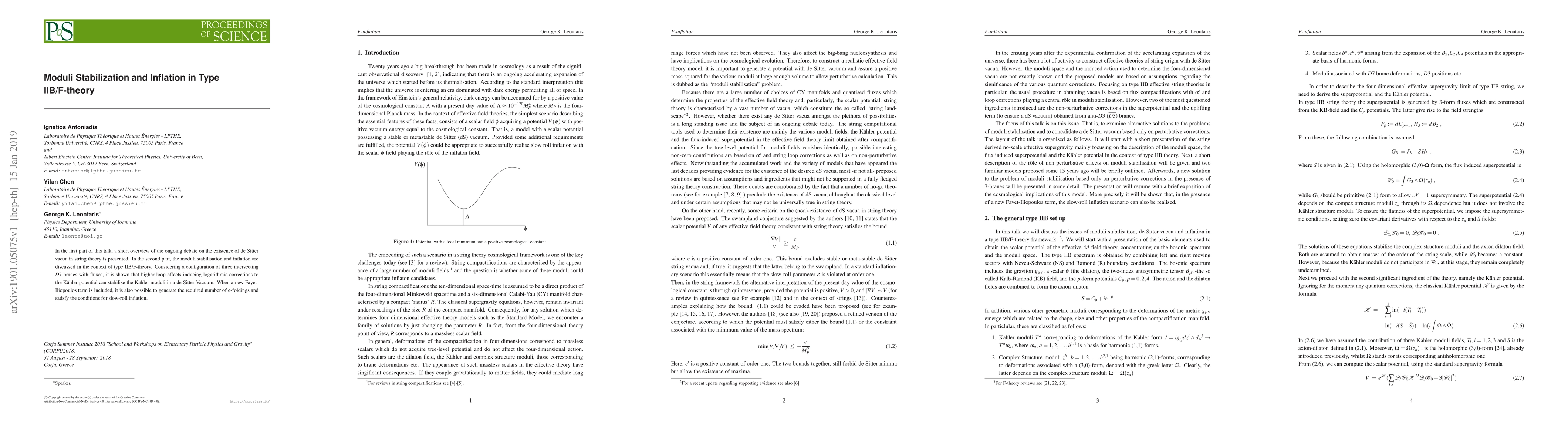 In the first part of this talk, a short overview of the ongoing debate on the existence of de Sitter vacua in string theory is presented. In the second part, the moduli stabilisation and inflation are discussed in the context of type IIB/F-theory. Considering a configuration of three intersecting $D7$ branes with fluxes, it is shown that higher loop effects inducing logarithmic corrections to the K\"ahler potential can stabilise the K\"ahler moduli in a de Sitter Vacuum. When a new Fayet-Iliopoulos term is included, it is also possible to generate the required number of e-foldings and satisfy the conditions for slow-roll inflation.