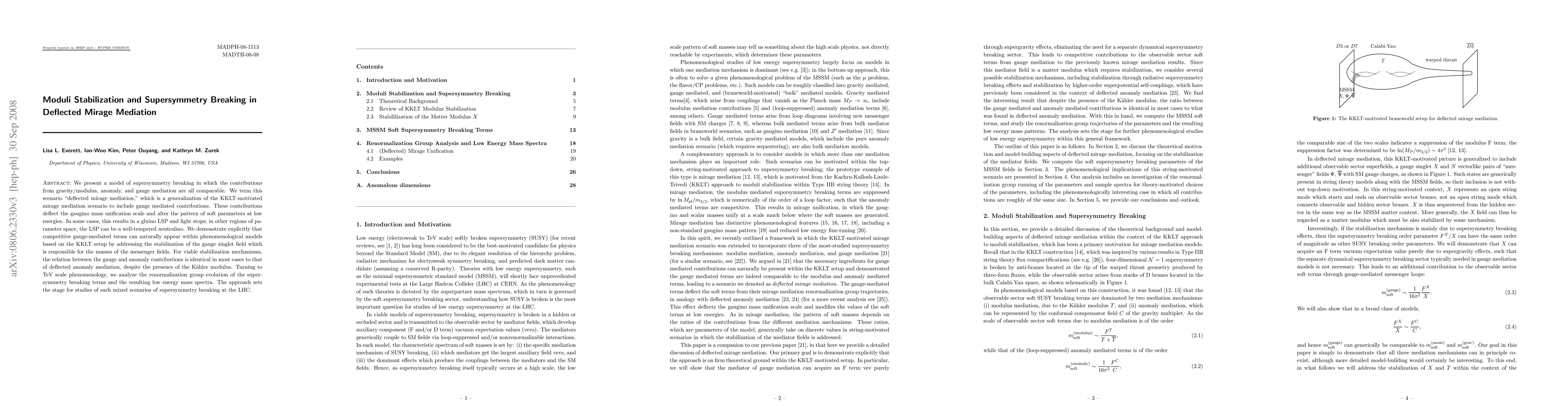 This paper proposes a "deflected mirage mediation" model where gravity, anomaly, and gauge mediation contribute comparably to supersymmetry breaking. It describes how these contributions alter the gaugino mass unification scale and soft parameter patterns, potentially leading to different lightest supersymmetric particle (LSP) candidates.