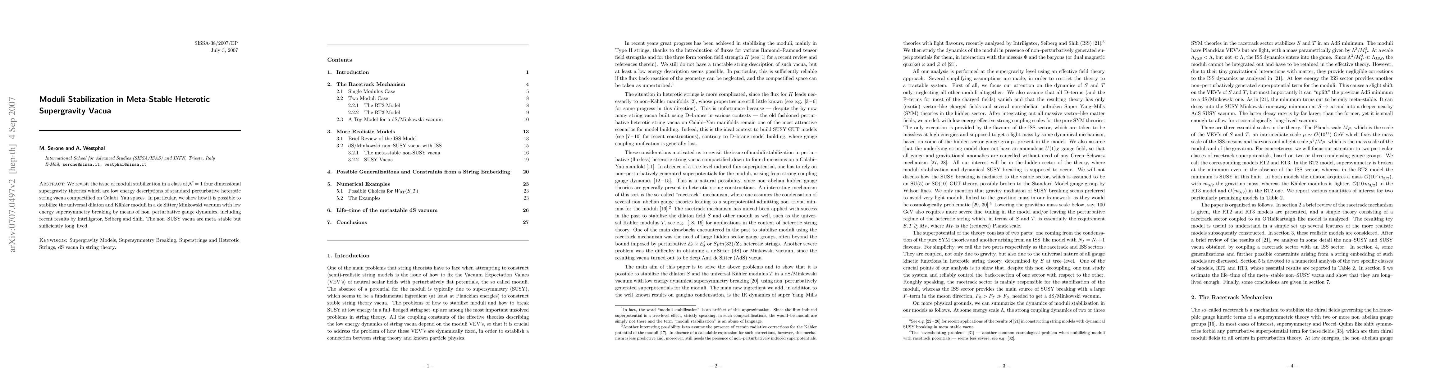 We revisit the issue of moduli stabilization in a class of N=1 four dimensional supergravity theories which are low energy descriptions of standard perturbative heterotic string vacua compactified on Calabi-Yau spaces. In particular, we show how it is possible to stabilize the universal dilaton and Kahler moduli in a de Sitter/Minkowski vacuum with low energy supersymmetry breaking by means of non-perturbative gauge dynamics, including recent results by Intriligator, Seiberg and Shih. The non-SUSY vacua are meta-stable but sufficiently long-lived.