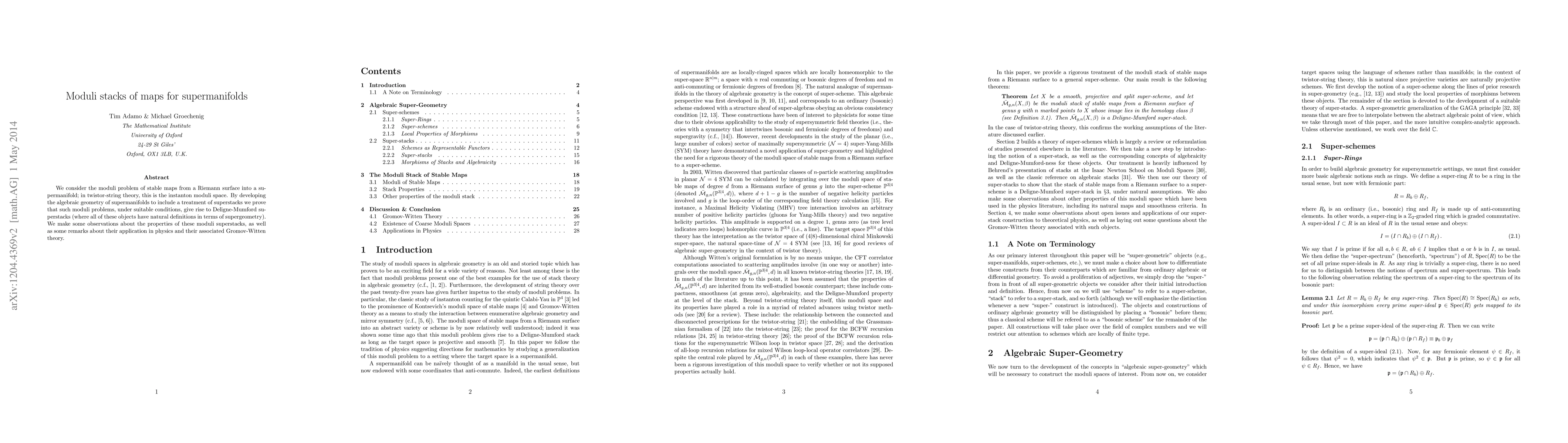 This paper develops the algebraic geometry of supermanifolds to include superstacks and proves that moduli problems of stable maps from a Riemann surface into a supermanifold yield Deligne-Mumford superstacks, with implications for twistor-string theory and Gromov-Witten theory in physics.