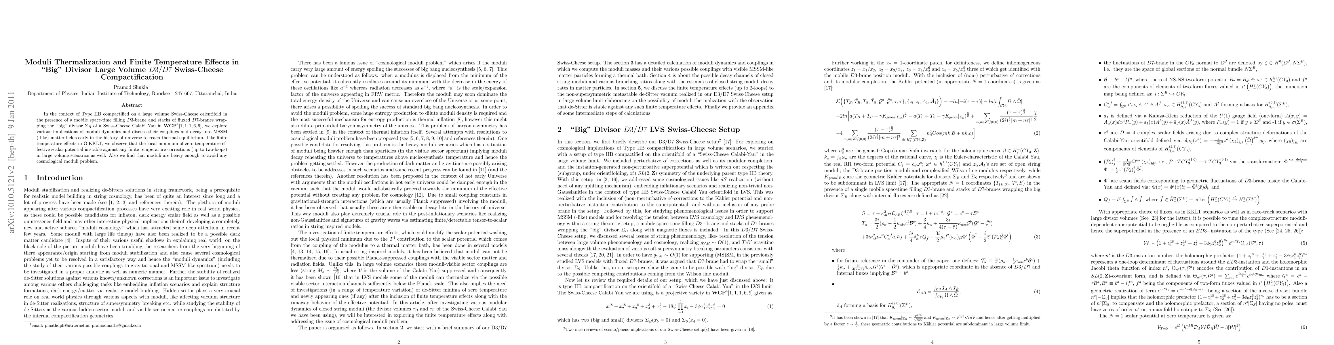 This research investigates moduli thermalization and finite temperature effects in a large volume Swiss-Cheese compactification within Type IIB string theory, showing stable effective scalar potentials and heavy moduli to prevent cosmological issues. The study focuses on the dynamics and decay of moduli into MSSM-like matter fields to achieve thermal equilibrium.