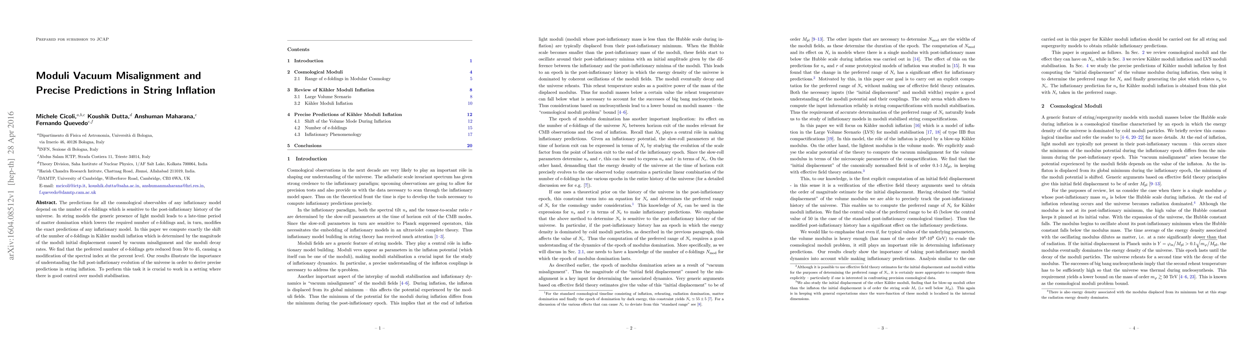 The predictions for all the cosmological observables of any inflationary model depend on the number of e-foldings which is sensitive to the post-inflationary history of the universe. In string models the generic presence of light moduli leads to a late-time period of matter domination which lowers the required number of e-foldings and, in turn, modifies the exact predictions of any inflationary model. In this paper we compute exactly the shift of the number of e-foldings in Kaehler moduli inflation which is determined by the magnitude of the moduli initial displacement caused by vacuum misalignment and the moduli decay rates. We find that the preferred number of e-foldings gets reduced from 50 to 45, causing a modification of the spectral index at the percent level. Our results illustrate the importance of understanding the full post-inflationary evolution of the universe in order to derive precise predictions in string inflation. To perform this task it is crucial to work in a setting where there is good control over moduli stabilisation.