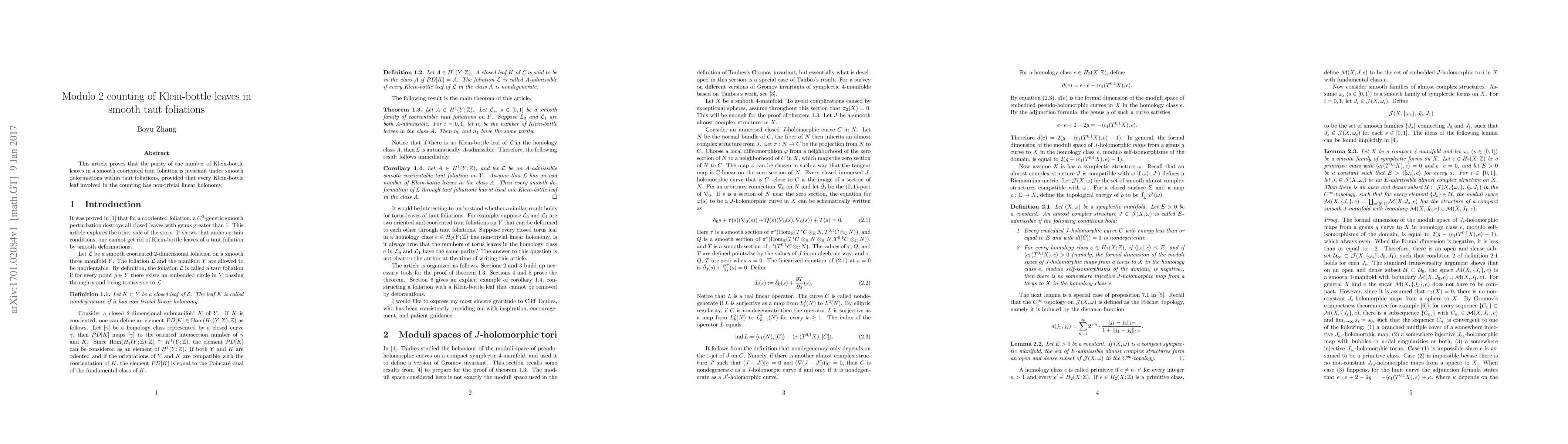 This paper demonstrates that the modulo 2 count of Klein-bottle leaves in smooth taut foliations remains unchanged under smooth deformations, given that each leaf has non-trivial linear holonomy. The result highlights the invariance of this parity in such foliations.