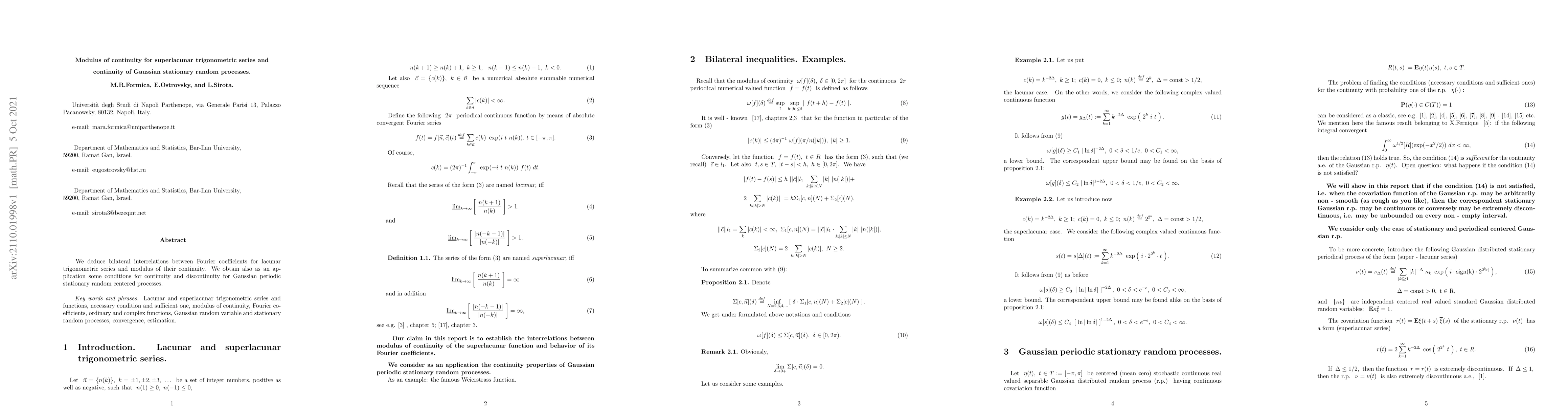 Summary: This paper establishes connections between the Fourier coefficients of lacunar trigonometric series and their modulus of continuity, and applies these findings to derive conditions for continuity and discontinuity in Gaussian stationary random processes.