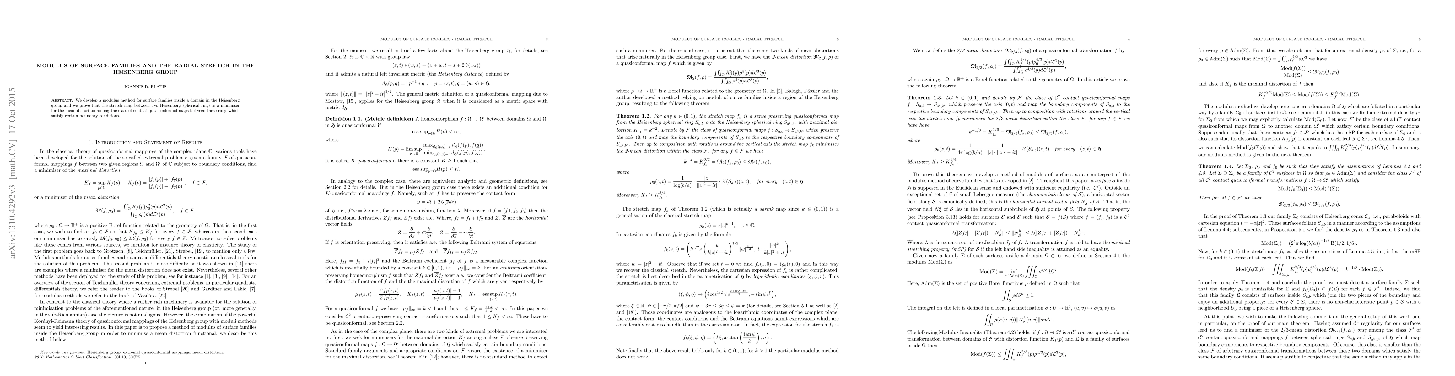 Summary: This paper introduces a modulus method for analyzing surface families in the Heisenberg group, proving that the radial stretch map minimizes mean distortion among contact quasiconformal maps between Heisenberg spherical rings under specified boundary conditions.