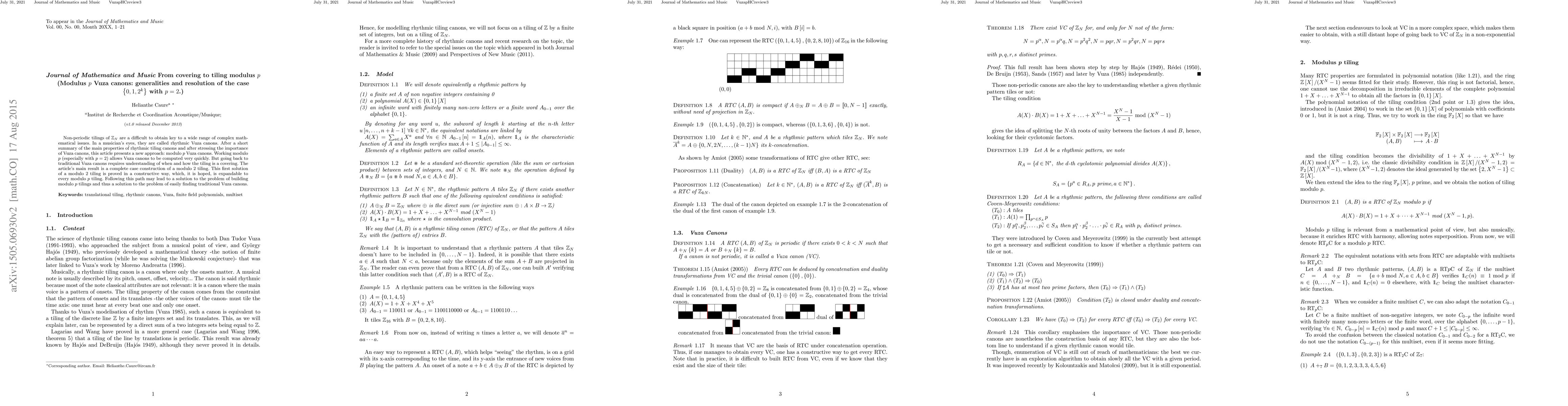 Non-periodic tilings of $\mathbb{Z}_N$ are a difficult to obtain key to a wide range of complex mathematical issues. In a musician's eyes, they are called rhythmic Vuza canons. After a short summary of the main properties of rhythmic tiling canons and after stressing the importance of Vuza canons, this article presents a new approach: modulo $p$ Vuza canons. Working modulo $p$ (especially with $p=2$) allows Vuza canons to be computed very quickly. But going back to traditional Vuza canons requires understanding of when and how the tiling is a covering. The article's main result is a complete case construction of a modulo $2$ tiling. This first solution of a modulo $2$ tiling is proved in a constructive way, which, it is hoped, is expandable to every modulo $p$ tiling. Following this path may lead to a solution to the problem of building modulo $p$ tilings and thus a solution to the problem of easily finding traditional Vuza canons.