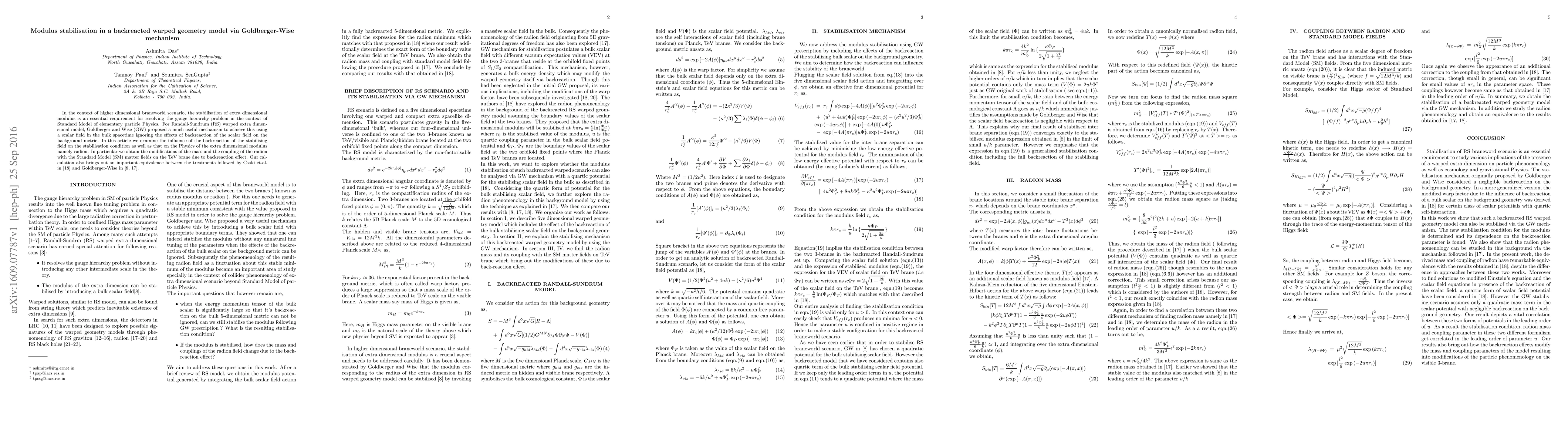 In the context of higher dimensional braneworld scenario, the stabilisation of extra dimensional modulus is an essential requirement for resolving the gauge hierarchy problem in the context of Standard Model of elementary particle Physics. For Randall-Sundrum (RS) warped extra dimensional model, Goldberger and Wise (GW) proposed a much useful mechanism to achieve this using a scalar field in the bulk spacetime ignoring the effects of backreaction of the scalar field on the background metric. In this article we examine the influence of the backreaction of the stabilising field on the stabilisation condition as well as that on the Physics of the extra dimensional modulus namely radion. In particular we obtain the modifications of the mass and the coupling of the radion with the Standard Model (SM) matter fields on the TeV brane due to backreaction effect. Our calculation also brings out an important equivalence between the treatments followed by Csaki et.al. in \cite{kribs} and Goldberger-Wise in \cite{GW1,GW_radion}.