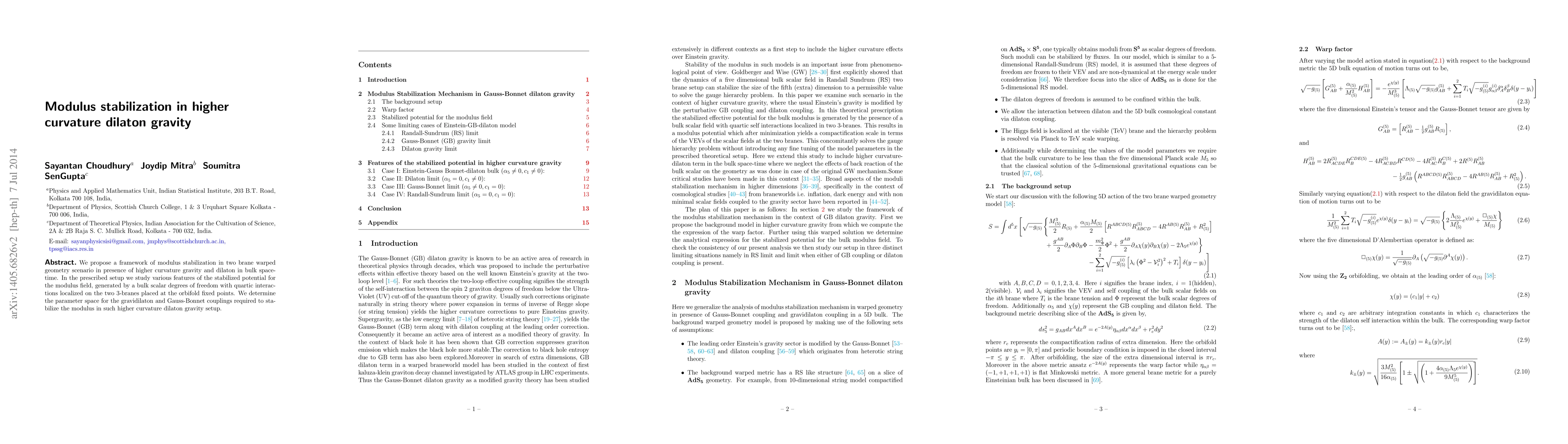 This paper proposes a framework for modulus stabilization in higher curvature dilaton gravity using a two-brane warped geometry. It determines the parameter space for gravidilaton and Gauss-Bonnet necessary to stabilize the modulus field in this setup.