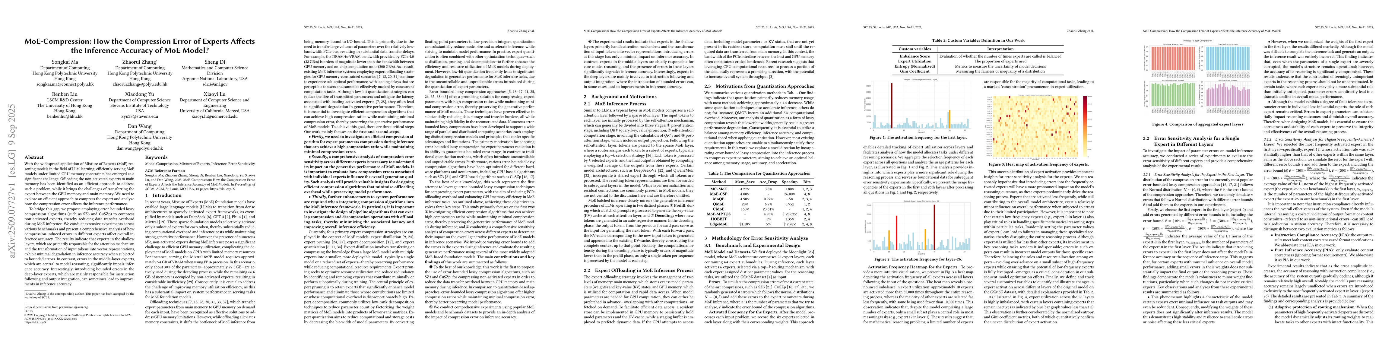 With the widespread application of Mixture of Experts (MoE) reasoning models in the field of LLM learning, efficiently serving MoE models under limited GPU memory constraints has emerged as a significant challenge. Offloading the non-activated experts to main memory has been identified as an efficient approach to address such a problem, while it brings the challenges of transferring the expert between the GPU memory and main memory. We need to explore an efficient approach to compress the expert and analyze how the compression error affects the inference performance. To bridge this gap, we propose employing error-bounded lossy compression algorithms (such as SZ3 and CuSZp) to compress non-activated experts, thereby reducing data transfer overhead during MoE inference. We conduct extensive experiments across various benchmarks and present a comprehensive analysis of how compression-induced errors in different experts affect overall inference accuracy. The results indicate that experts in the shallow layers, which are primarily responsible for the attention mechanism and the transformation of input tokens into vector representations, exhibit minimal degradation in inference accuracy when subjected to bounded errors. In contrast, errors in the middle-layer experts, which are central to model reasoning, significantly impair inference accuracy. Interestingly, introducing bounded errors in the deep-layer experts, which are mainly responsible for instruction following and output integration, can sometimes lead to improvements in inference accuracy.
