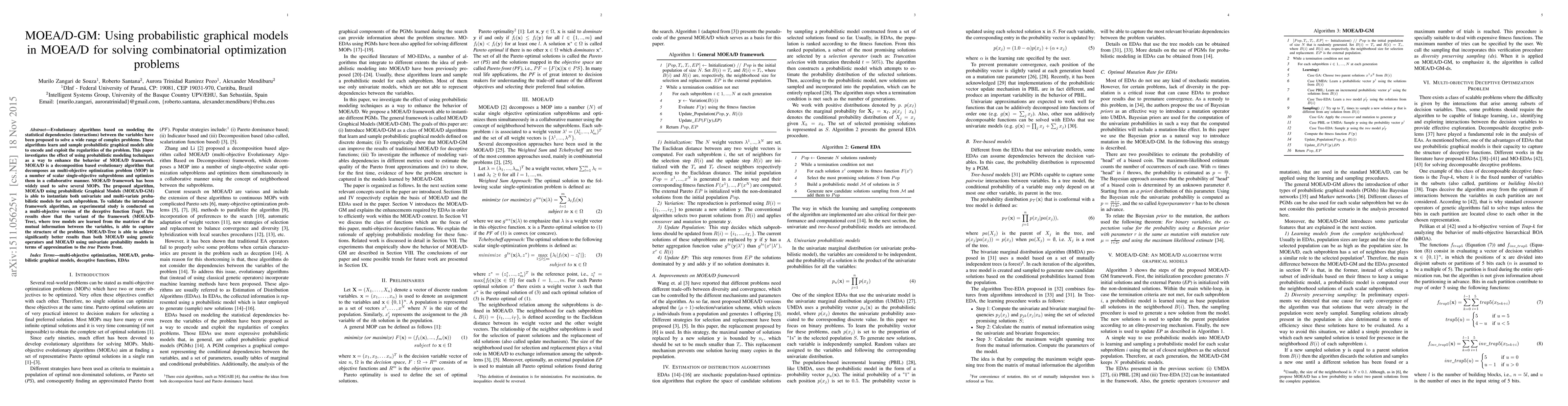 This paper proposes MOEA/D-GM, an enhanced version of MOEA/D that incorporates probabilistic graphical models to better solve complex combinatorial optimization problems. Experimental results on the multi-objective version of the Trap5 function demonstrate that MOEA/D-Tree, which uses tree models based on mutual information, significantly outperforms traditional MOEA/D variants in achieving a closer approximation to the true Pareto front.