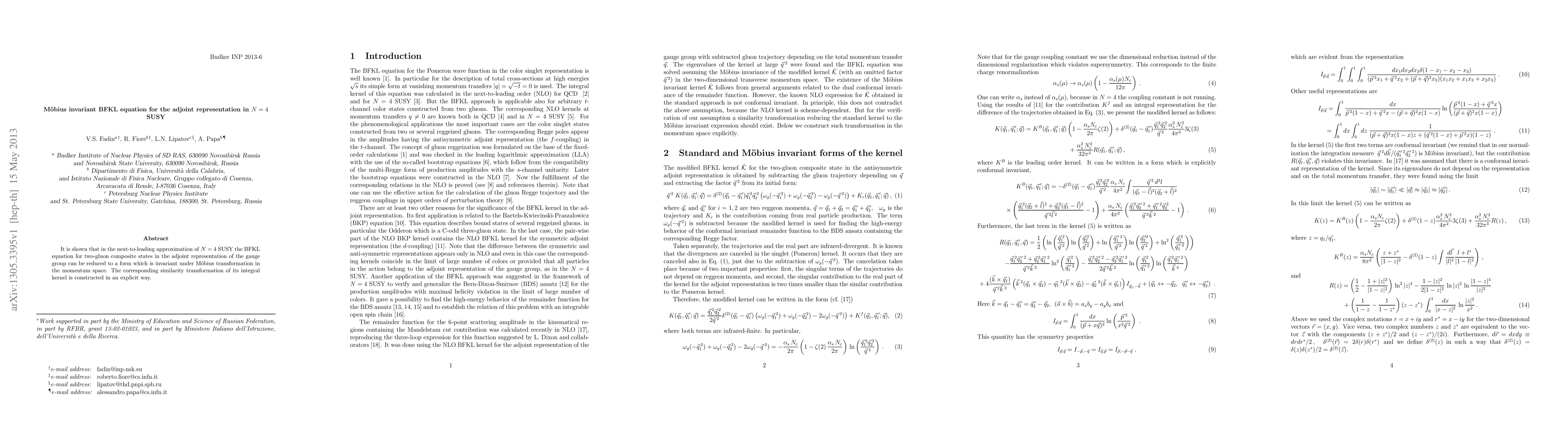 It is shown that in the next-to-leading approximation of N=4 SUSY the BFKL equation for two-gluon composite states in the adjoint representation of the gauge group can be reduced to a form which is invariant under Moebius transformation in the momentum space. The corresponding similarity transformation of its integral kernel is constructed in an explicit way.