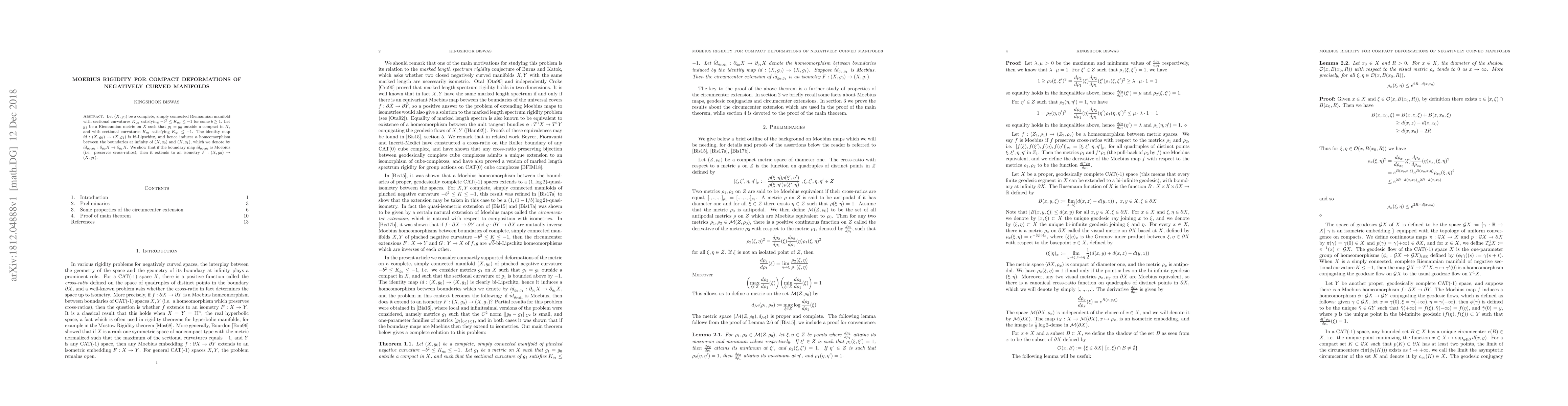 Let $(X, g_0)$ be a complete, simply connected Riemannian manifold with sectional curvatures $K_{g_0}$ satisfying $-b^2 \leq K_{g_0} \leq -1$ for some $b \geq 1$. Let $g_1$ be a Riemannian metric on $X$ such that $g_1 = g_0$ outside a compact in $X$, and with sectional curvatures $K_{g_1}$ satisfying $K_{g_1} \leq -1$. The identity map $id : (X, g_0) \to (X, g_1)$ is bi-Lipschitz, and hence induces a homeomorphism between the boundaries at infinity of $(X, g_0)$ and $(X, g_1)$, which we denote by $\hat{id}_{g_0, g_1} : \partial_{g_0} X \to \partial_{g_1} X$. We show that if the boundary map $\hat{id}_{g_0, g_1}$ is Moebius (i.e. preserves cross-ratios), then it extends to an isometry $F : (X, g_0) \to (X, g_1)$.